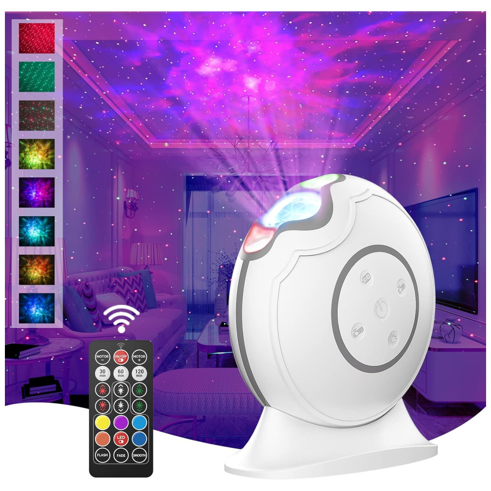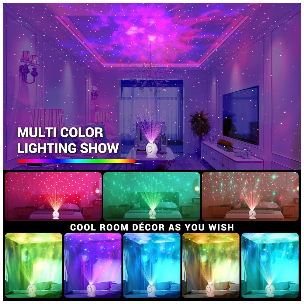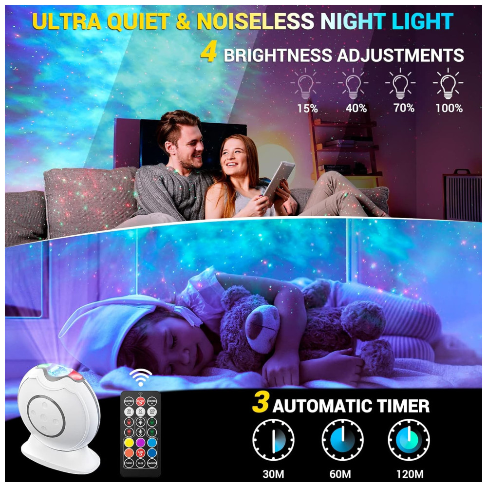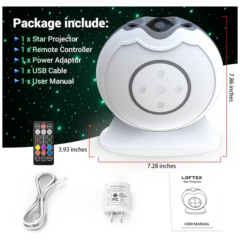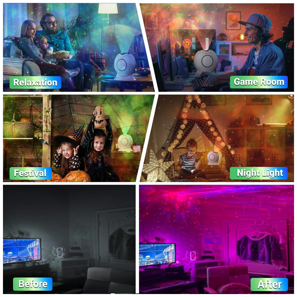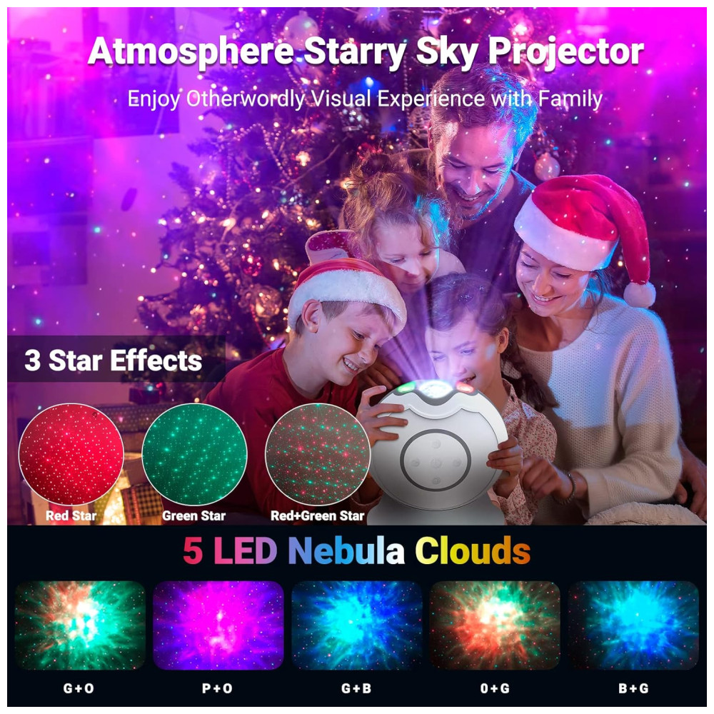 3D Aurora Starlight Show projetor de estrelas LOFTEK com efeito 3D que projeta instantaneamente milhões de estrelas vermelhas e verdes contra uma transformação de 5 multicoloridas de nuvens de nebulosa de laser que preenchem o teto e a parede de maneira adequada. Você pode fazer com que as estrelas e as nuvens da nebulosa funcionem em uníssono ou independentemente. Eles podem ser estáticos ou em movimento, rápidos ou lentos, aparecem e desaparecem gradualmente os efeitos de iluminação magníficos e oníricos fazem você se sentir como se estivesse vagando pelo céu estrelado