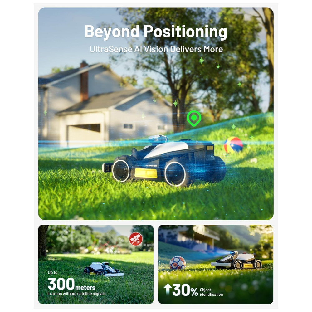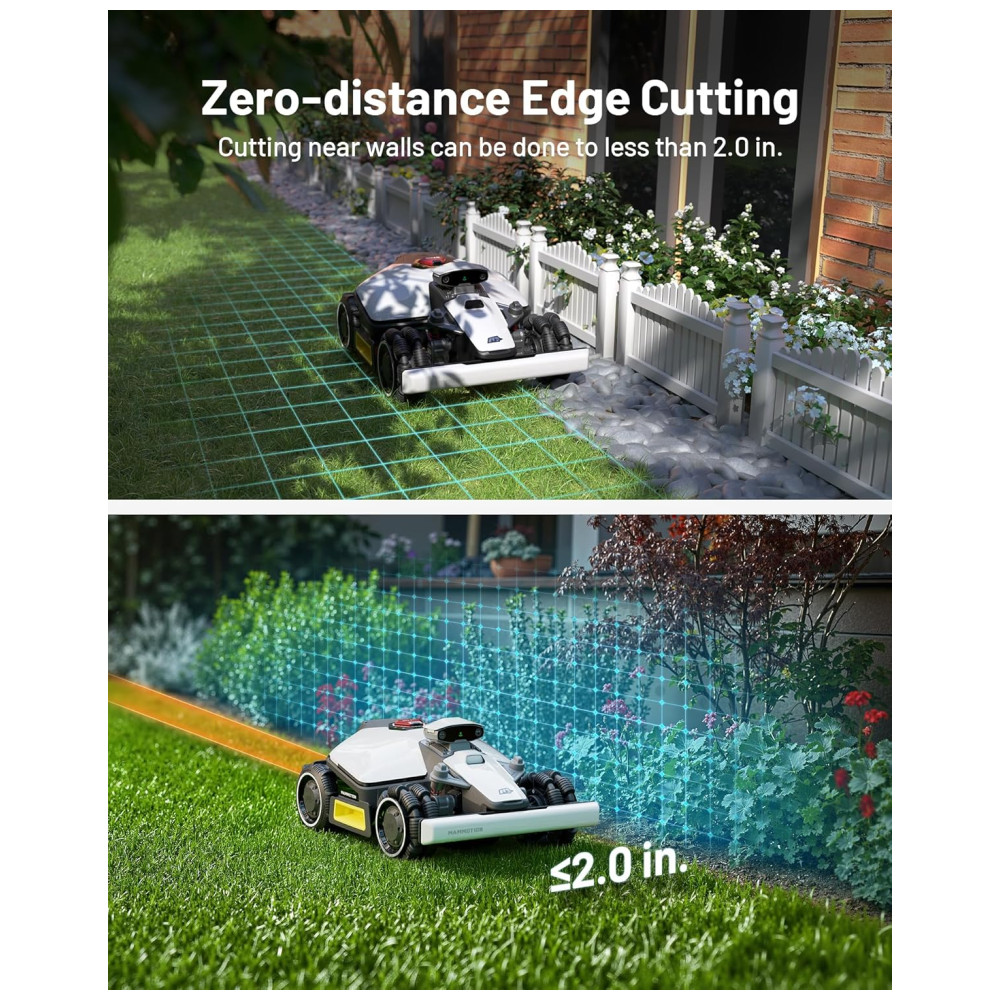 Desfrute de uma capacidade off-road incomparável com o Cortador de Grama Robô LUBA Mini. Sua potente capacidade de superar obstáculos e sistema de suspensão adaptativa permitem que ele atravesse suavemente encostas íngremes, buracos, terrenos acidentados ou grama alta e espessa. Equipado com um motor de lâmina de 88W, largura de corte de até 20cm e design de rodas omnidirecionais de giro zero, maximiza a eficiência das tarefas de corte mesmo em ambientes consistentemente úmidos. Com recursos inteligentes para cuidar do gramado sem esforço, como a Visão AI UltraSense combinada com o sistema de navegação RTK, o LUBA Mini consegue cortar sob árvores sem sinal de satélite. Graças ao poderoso posicionamento visual, reconhece com precisão os limites do gramado e realiza um corte de borda sem distância. Além disso, apresenta um sistema inteligente de desvio de obstáculos com mais de 200 objetos reconhecidos.