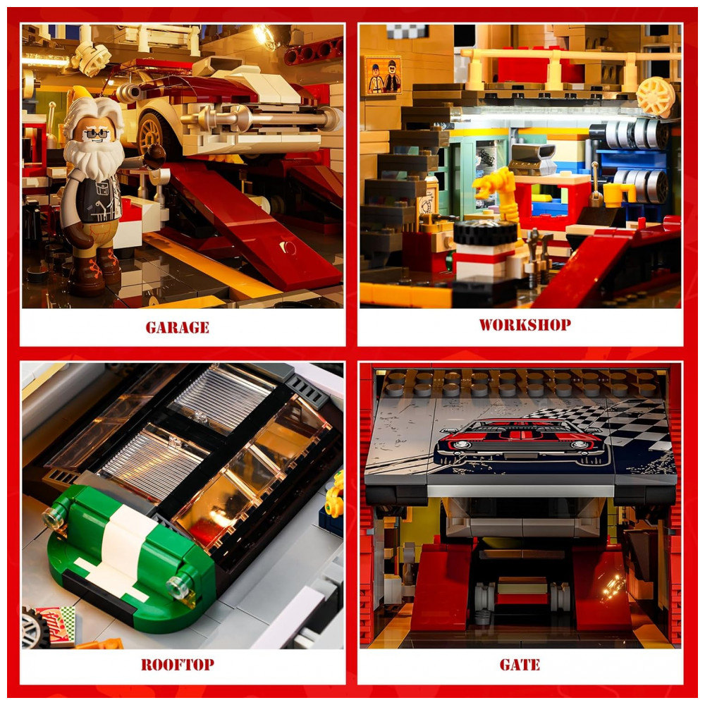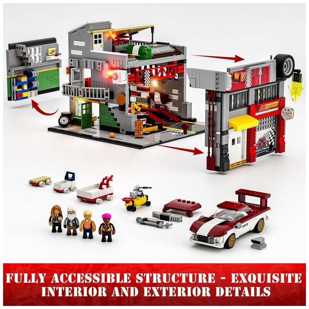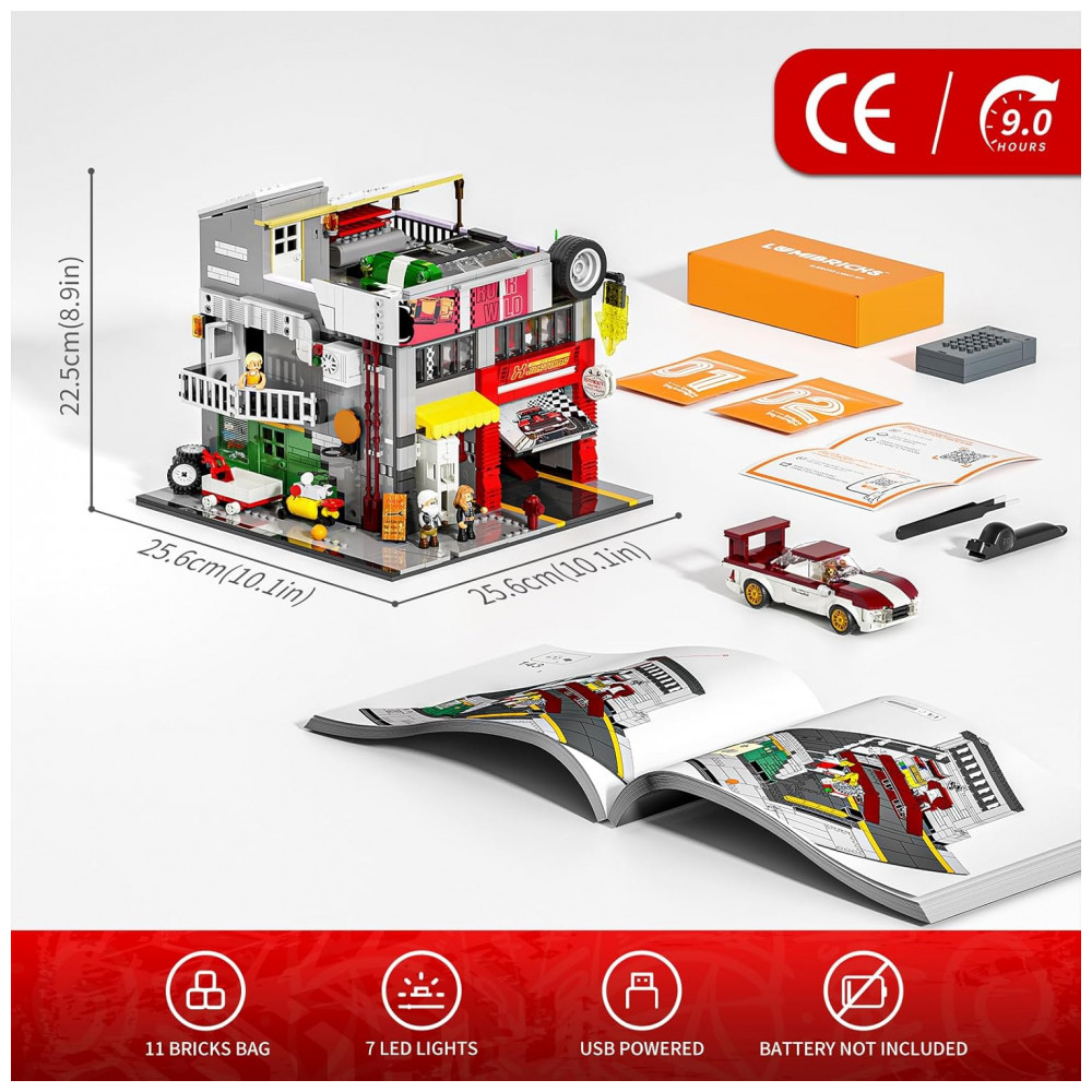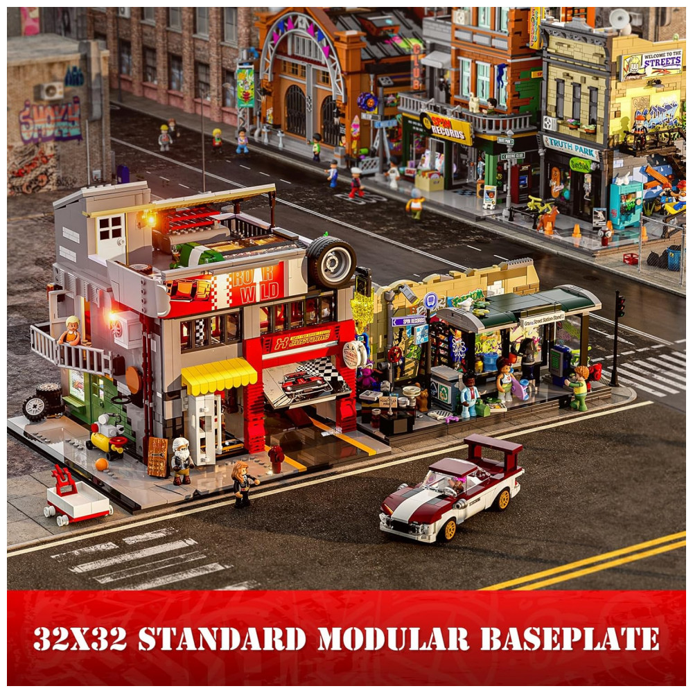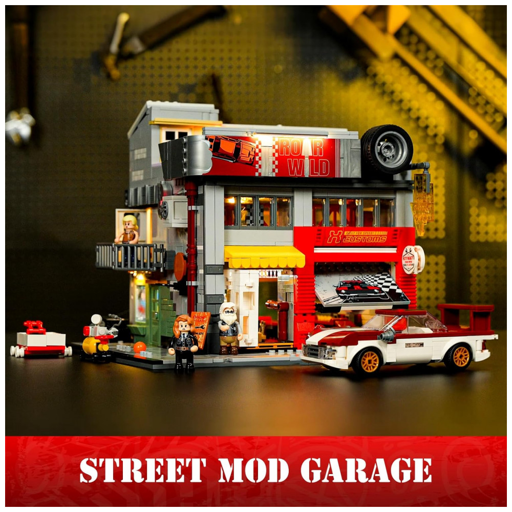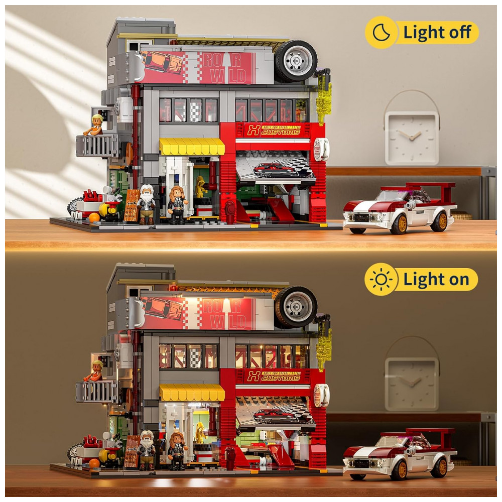 O sistema de iluminação integrado conta com 7 pontos de luz, incluindo faixa COB LED que simula letreiros de néon e iluminação interna voltada para área de trabalho e boxes de carro. O conjunto foi desenvolvido para montagem por adolescentes e adultos a partir de 16 anos, com foco em construção detalhada e exibição em coleções de cidade e arquitetura.