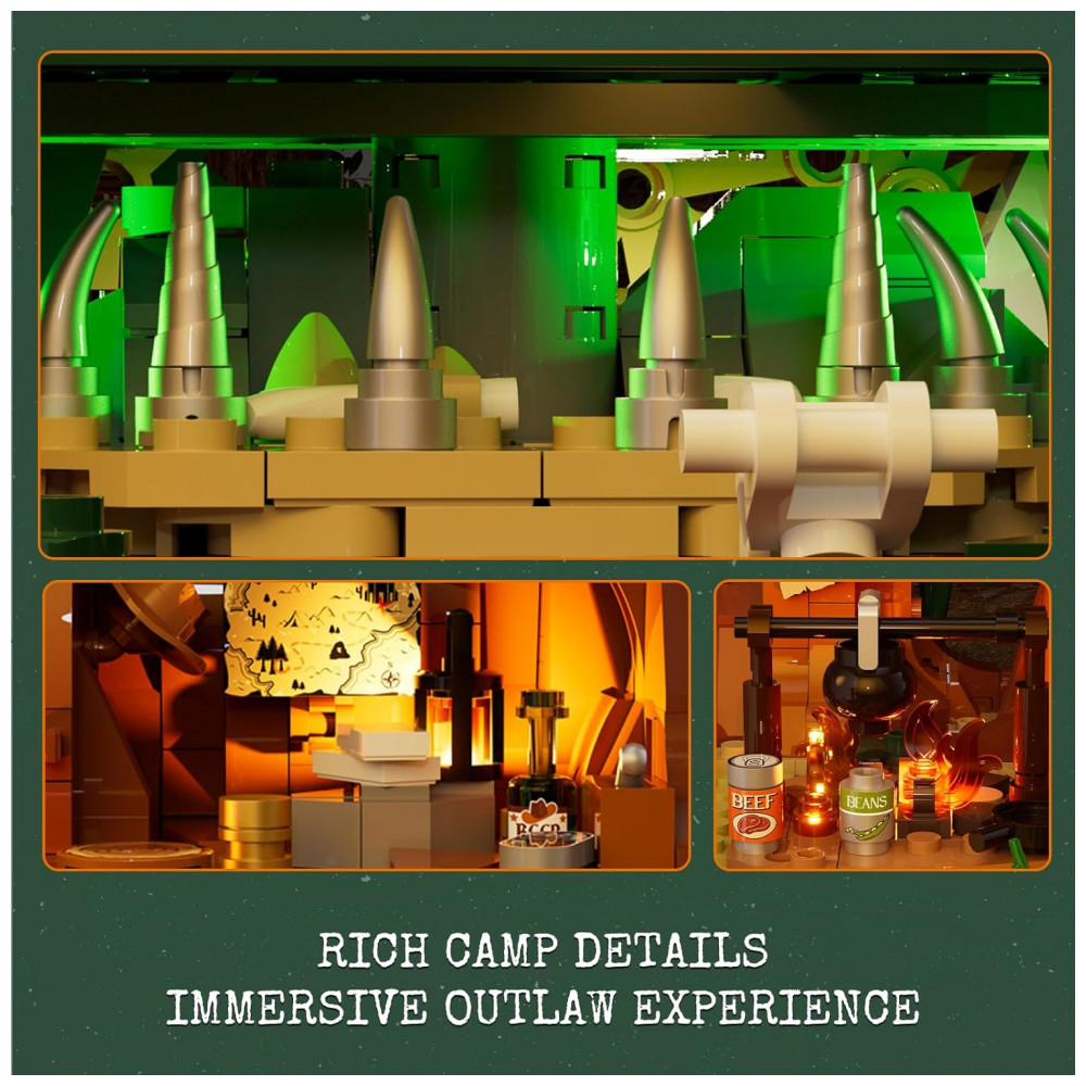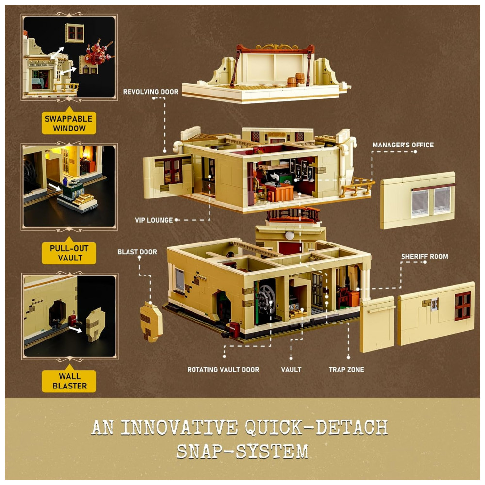 Os dois modelos compartilham narrativa com personagens recorrentes, como líder de bando, procurado em cartazes no banco e figura de ave de rapina associada ao esconderijo, permitindo construir uma história contínua de roubo de ouro e perseguição até o acampamento. O conjunto é voltado para colecionadores e fãs de cenários western, com alta contagem de peças, foco em exibição e compatibilidade com outros itens da linha Lumibricks Western.