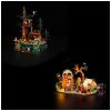 O banco utiliza sistema de iluminação com efeitos dramáticos, incluindo explosão luminosa em janela frontal, modo de luz pulsante, pontos internos e elementos que realçam o cofre e a entrada principal. Já o acampamento de bandidos conta com pontos de luz distribuídos em fogueira, holofote giratório e áreas de armadilha, criando atmosfera de esconderijo em floresta.