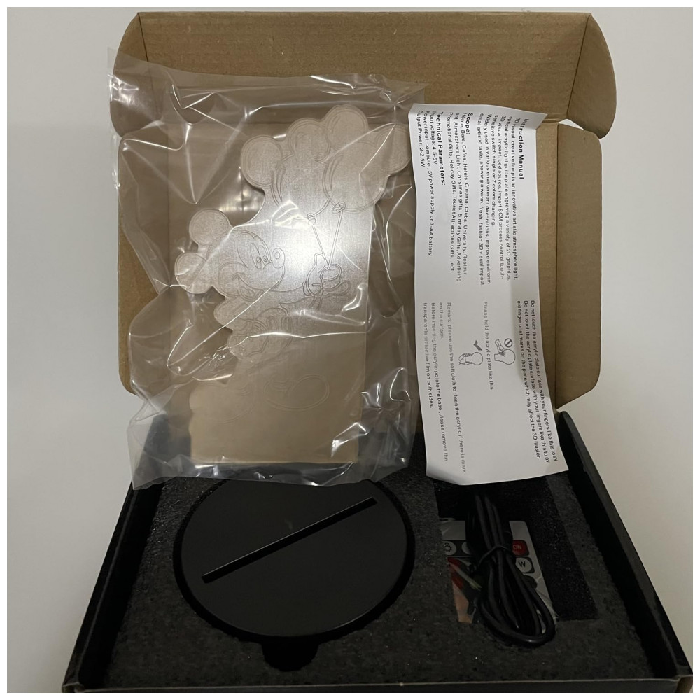 A luminária 3D Mickey da CUTIA é composta por placa de acrílico transparente com efeito visual tridimensional, base em ABS polido e interface USB tipo C. Gera iluminação decorativa LED regulável em 16 cores via controle remoto ou toque, podendo ser alimentada por 3 pilhas AA (não inclusas) ou cabo USB. Ideal para quartos infantis, dormitórios, festas, bares, hotéis, cinemas e ambientes variados. Produto portátil, eficiente e de fácil instalação, indicada para auxiliares noturnos e decoração de ambientes. Não é à prova d’água.