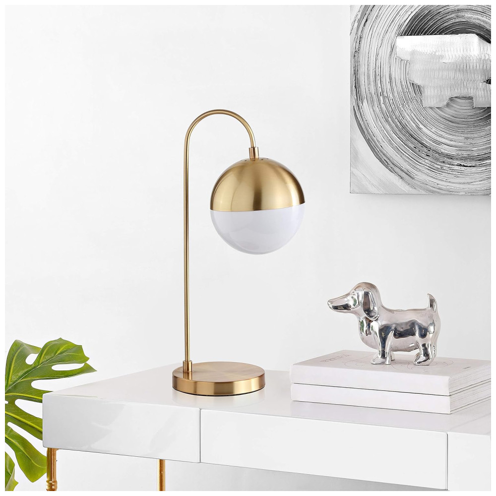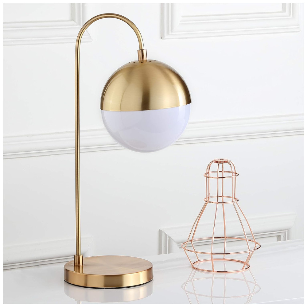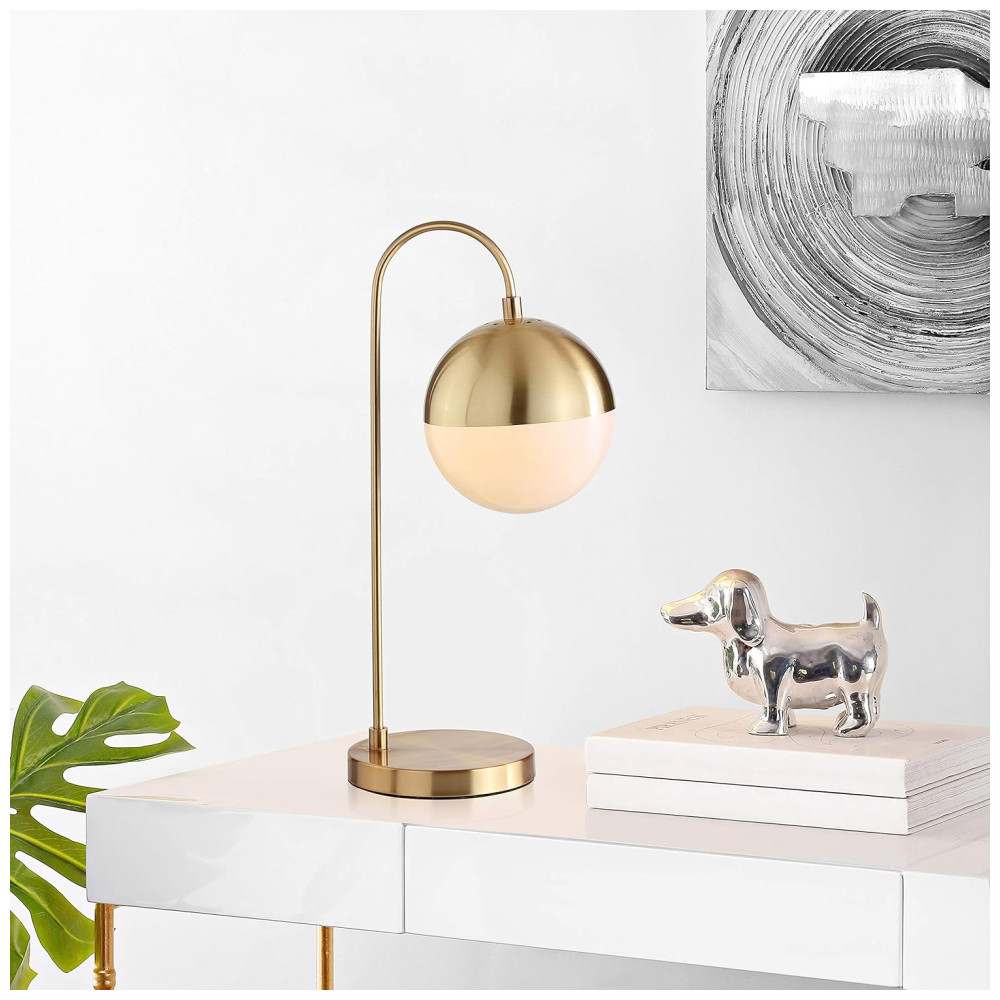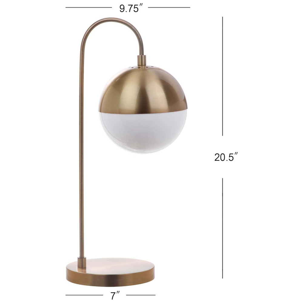 Este abajur contemporâneo, inspirado no ousado estilo moderno de meados do século, destaca-se com seu luxuoso acabamento em latão e ouro. A cúpula em formato de globo, parcialmente branca, difunde a luz de maneira a criar um brilho aconchegante e sofisticado, transformando qualquer ambiente com um toque de elegância.