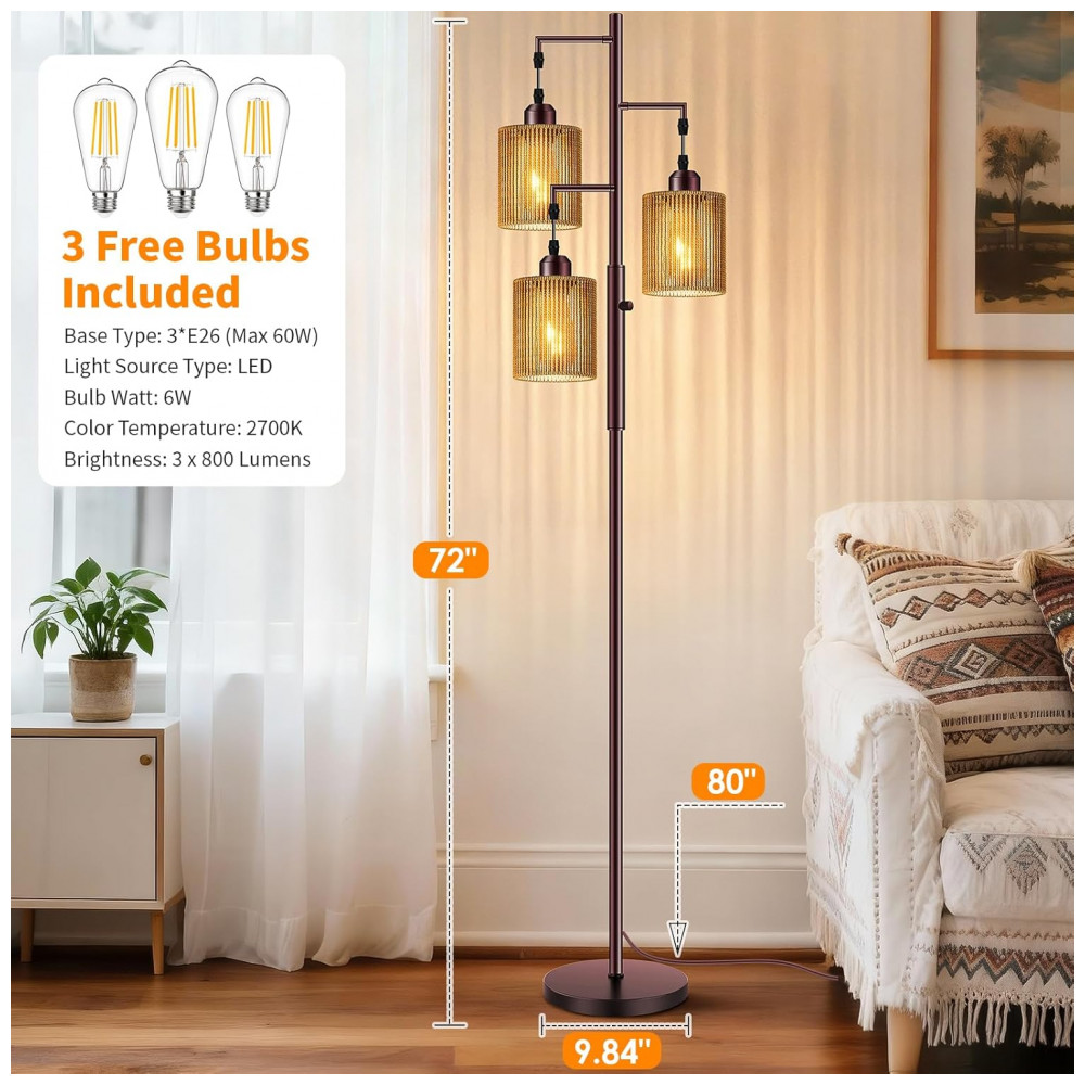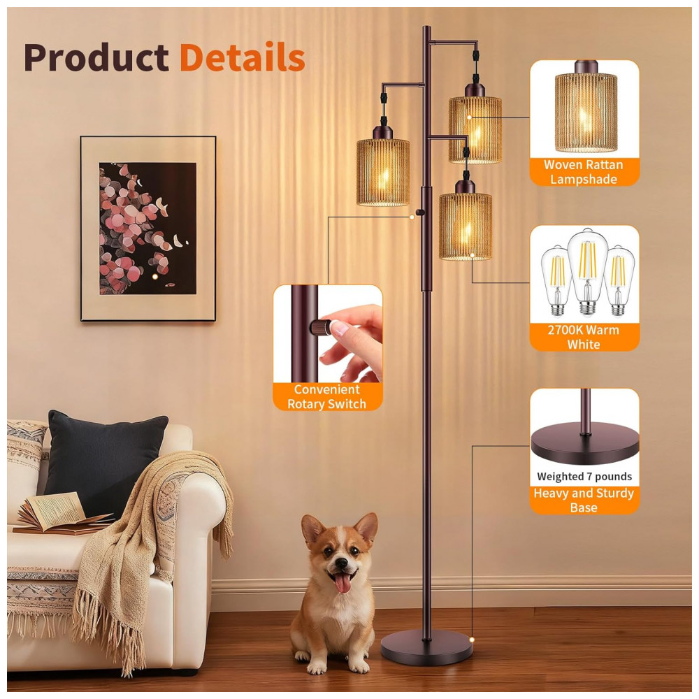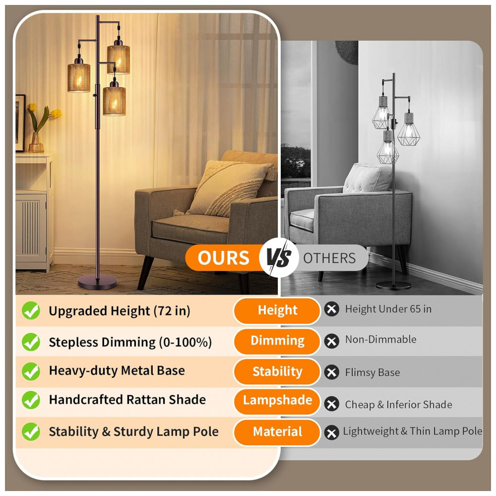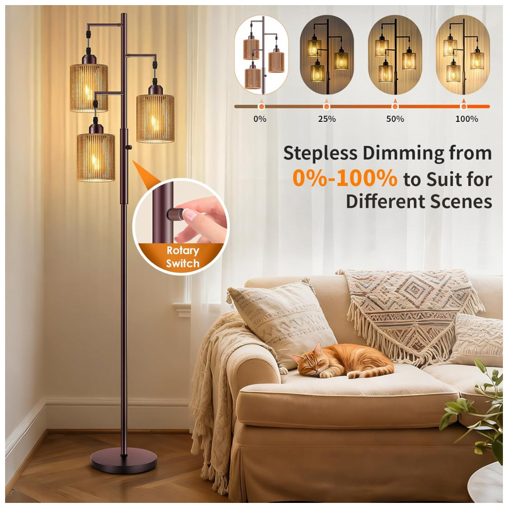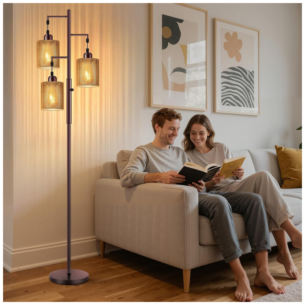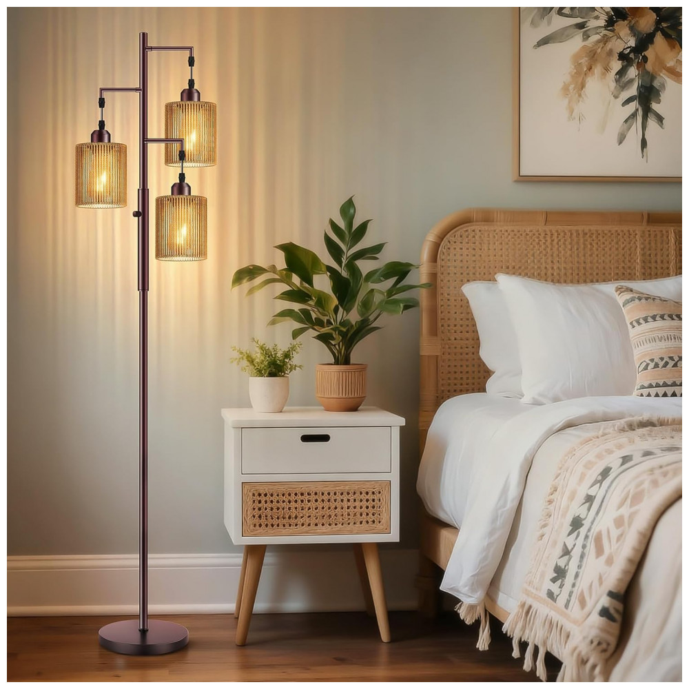A luminária de piso Hotsonic boho em rattan combina estrutura metálica alta com três cúpulas artesanais em rattan listrado marrom, formando uma peça de iluminação decorativa para sala de estar, quarto, escritório e áreas de leitura. O design tipo “árvore” distribui a luz em três pontos, criando iluminação ambiente quente e uniforme, adequada para cantos, ao lado de sofás ou poltronas.
