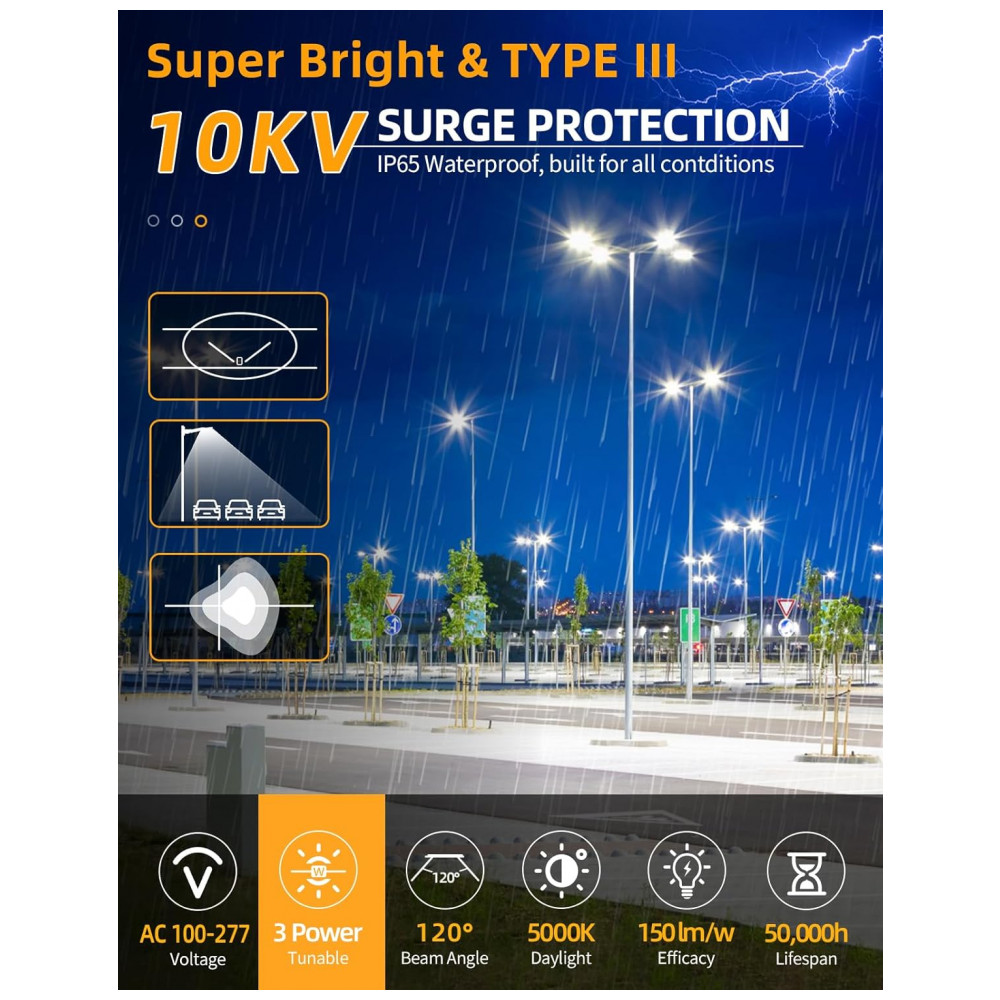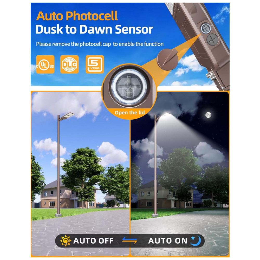 FOTOCÉLULA INCLUÍDA E À PROVA DE ÁGUA IP65 A luz de rua Led é integrada com um sensor de fotocélula e liga automaticamente ao pôr do sol, noite e desliga ao nascer do sol, dia. IP65 à prova dágua e proteção contra surtos de alta tensão 6K para secagem, ambiente úmido, tempestades de areia, tempestades de neve e condições climáticas adversas.