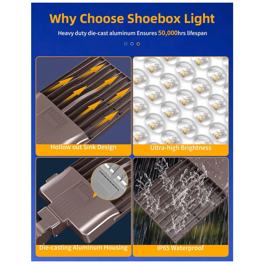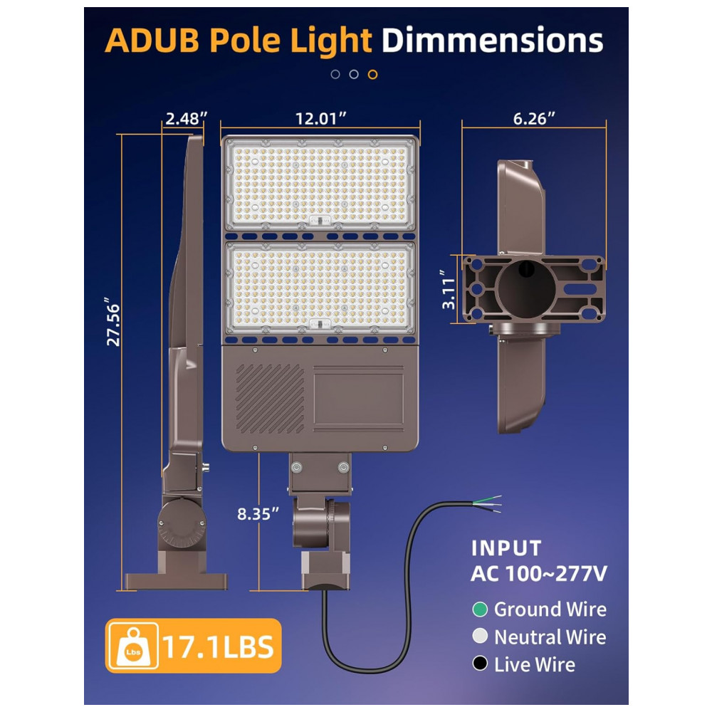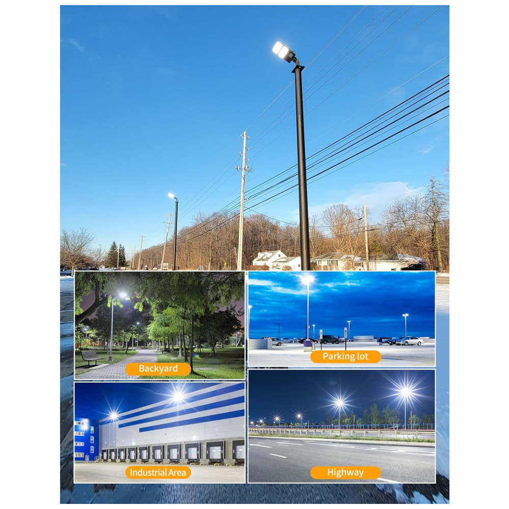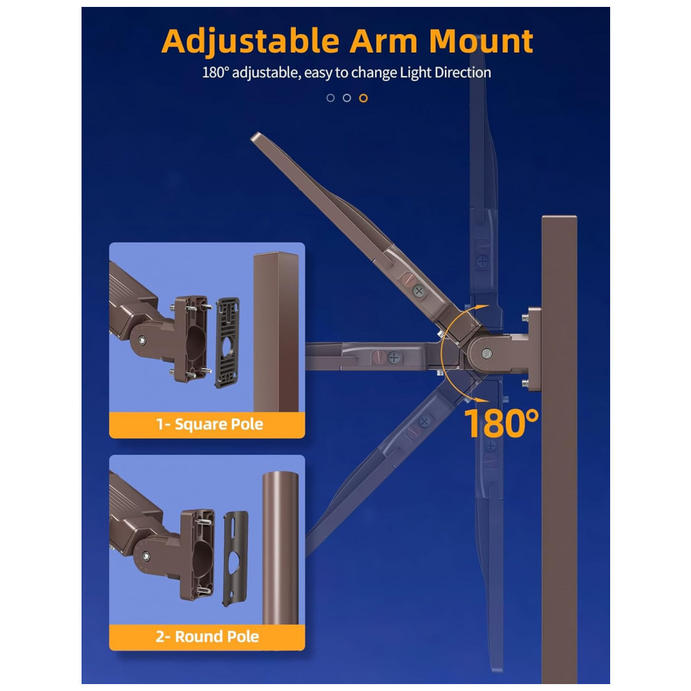INSTALAÇÃO FLEXÍVEL FÁCIL Ambos os pólos redondos e quadrados estão disponíveis para sua instalação. Acessório de instalação incluído. A luz de caixa de sapato LED de 320 W vem com uma montagem de braço ajustável de 90 90 graus, adaptando se a uma direção de iluminação mais flexível. Ideal para quadra de basquete, quadra de tênis, estádio, estacionamento, estradas, passarela, exterior, calçada e iluminação geral de grandes áreas.