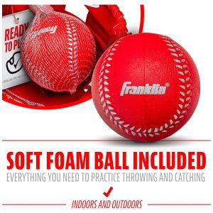 BOLA DE ESPUMA INCLUÍDA Esta luva vem com sua própria bola de beisebol de espuma macia para que você tenha tudo o que precisa para praticar o arremesso e a captura, seja dentro ou fora de casa