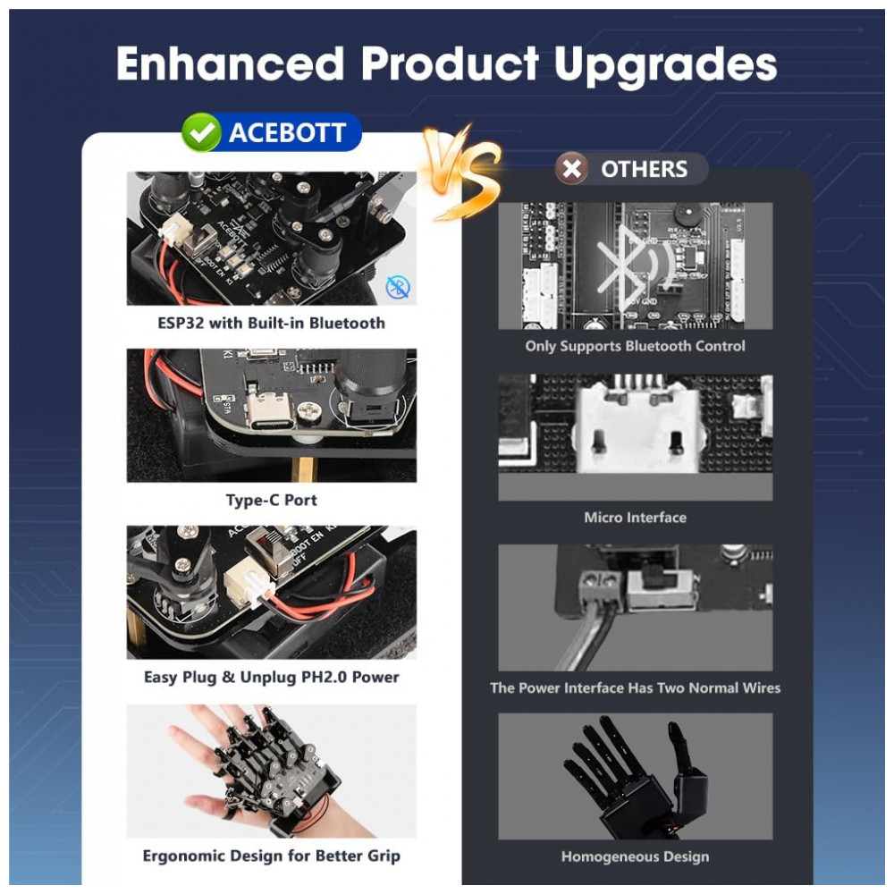 Integração recomendada: Compatível com kits robóticos ACEBOTT (carros ESP32, robôs bípedes, braços robóticos, mãos mecânicas), podendo ser adaptada a outros projetos Arduino‑compatíveis