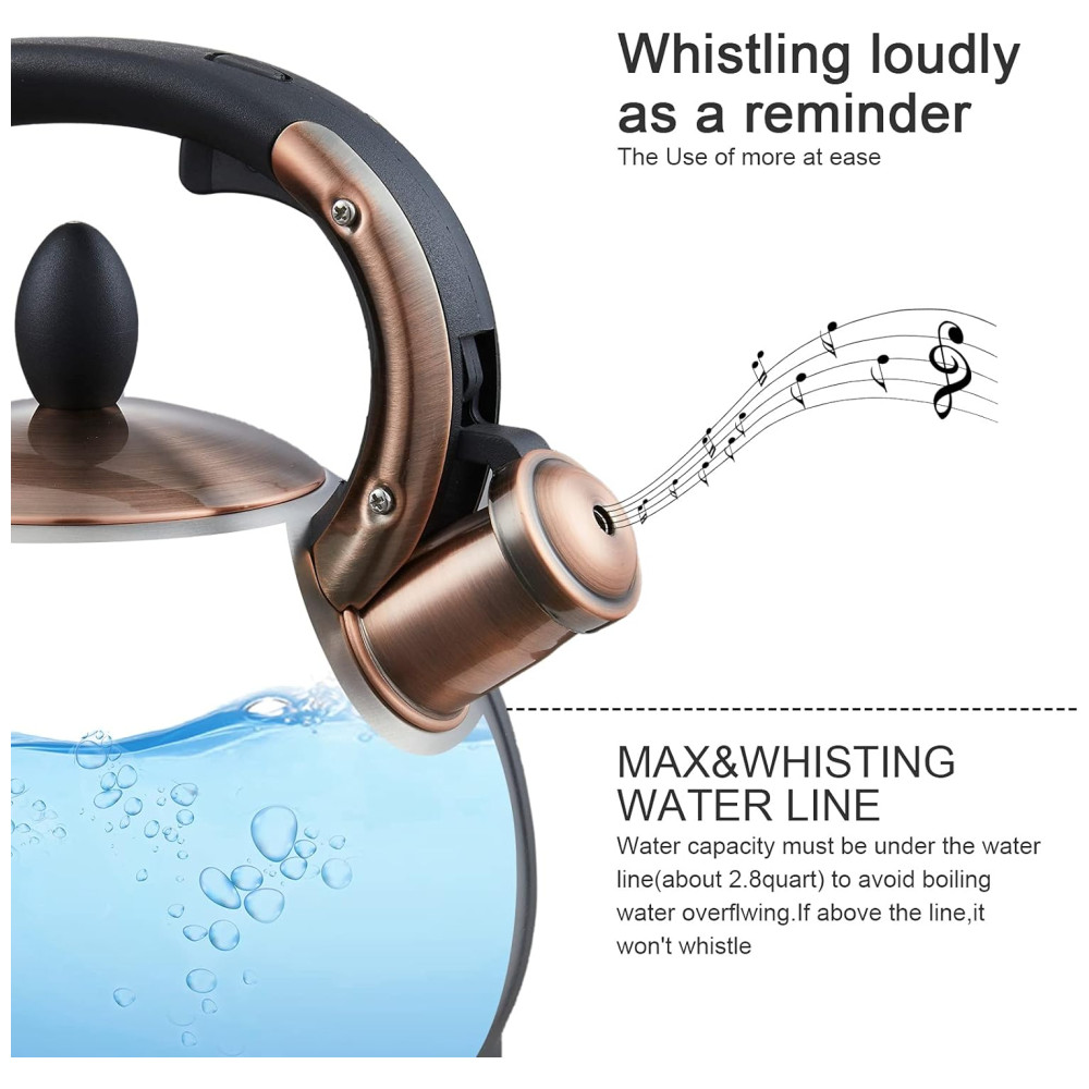 Assobio alto Quando a água está fervendo, a chaleira de assobio emitirá automaticamente um assobio, para que você possa ouvir um assobio alto e único. Quando você está se concentrando em outras questões como tarefas domésticas, assistir TV ou jogos, o apito da chaleira chamará sua atenção. Economiza tempo, é simples e sem estresse.