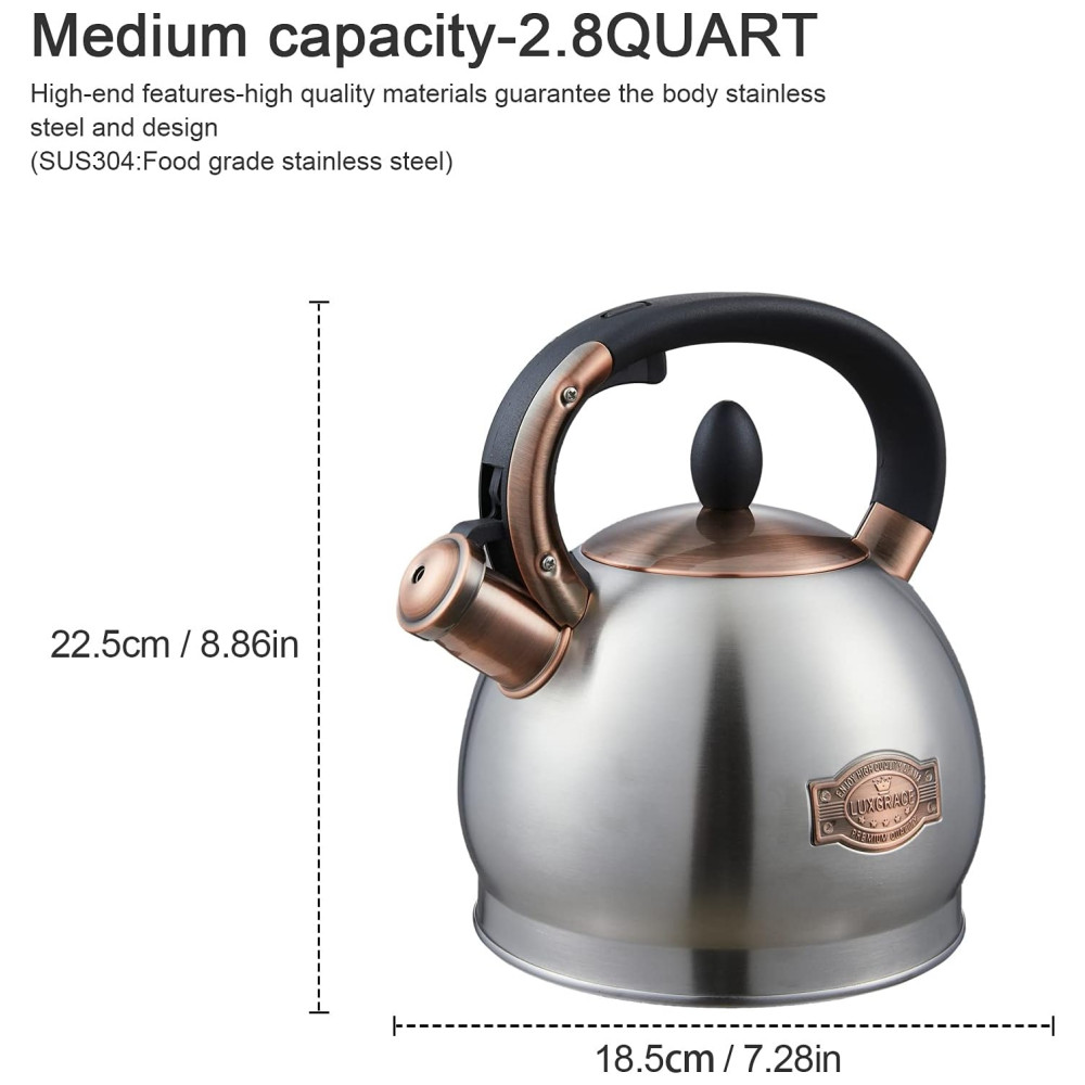 Capacidade adequada. Chaleira de aço inoxidável de 2,5 QT, 2 Litros economiza seu tempo e energia, sendo adequada para uso familiar A abertura maior do bule torna mais fácil encher e limpar o bule de chá do fogão. O design exclusivo do ângulo de abertura da bica pode não apenas abrir a tampa e encher com água, mas também rapidamente encher com água através da bica.