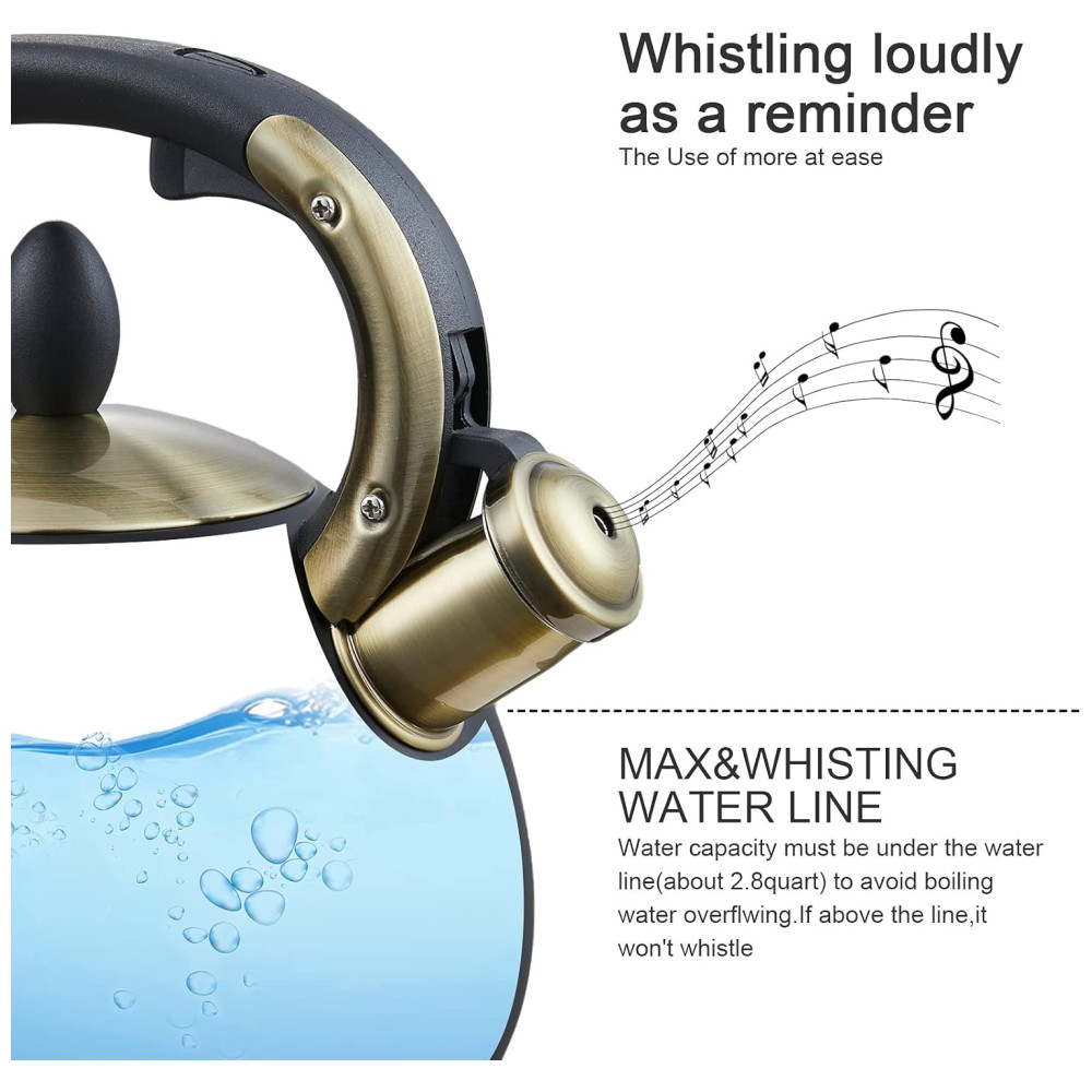 Assobio alto Quando a água está fervendo, a chaleira de assobio emitirá automaticamente um assobio, para que você possa ouvir um assobio alto e único. Quando você está se concentrando em outras questões como tarefas domésticas, assistir TV ou jogos, o apito da chaleira chamará sua atenção. Economiza tempo, é simples e sem estresse.