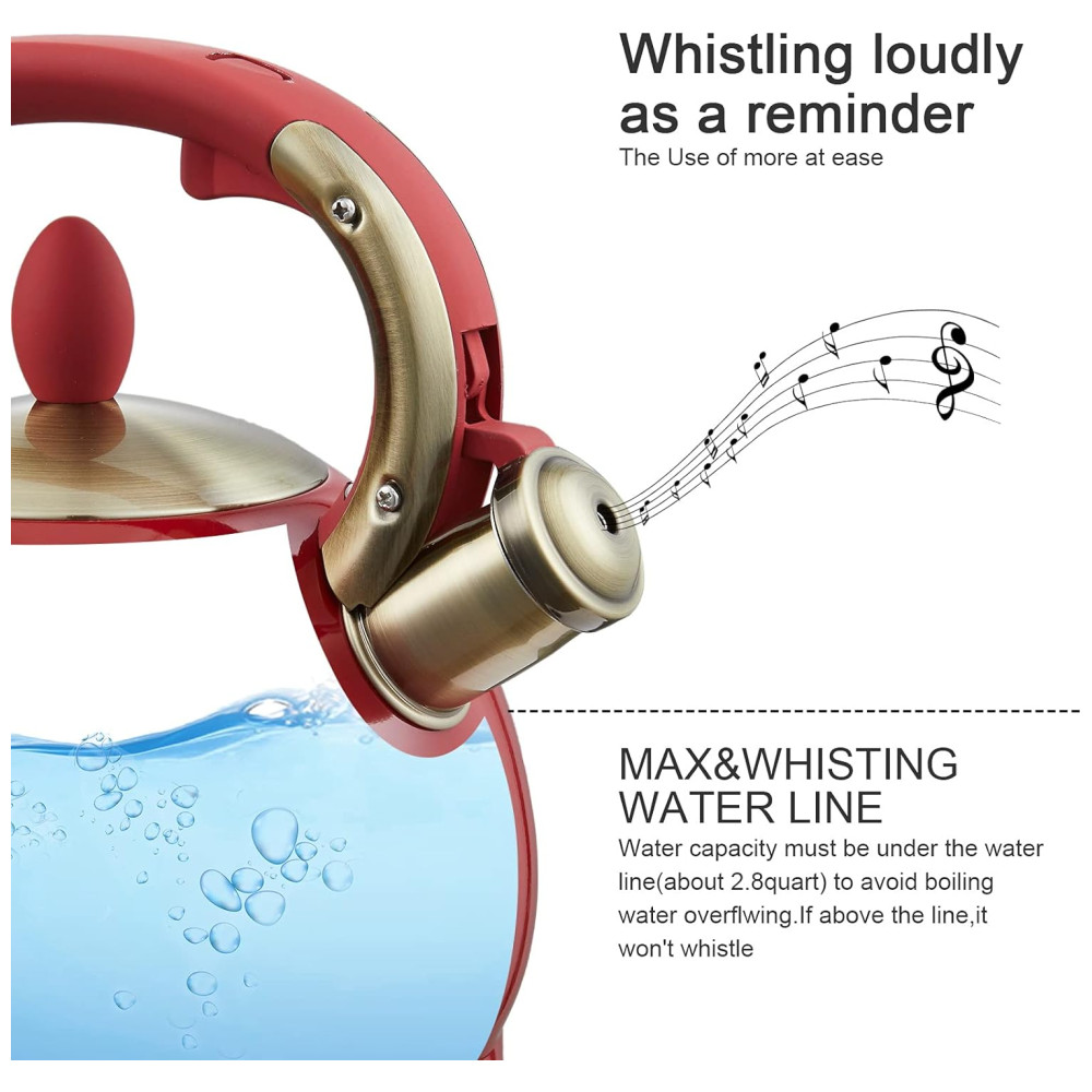 Assobio alto Quando a água está fervendo, a chaleira de assobio emitirá automaticamente um assobio, para que você possa ouvir um assobio alto e único. Quando você está se concentrando em outras questões como tarefas domésticas, assistir TV ou jogos, o apito da chaleira chamará sua atenção. Economiza tempo, é simples e sem estresse.