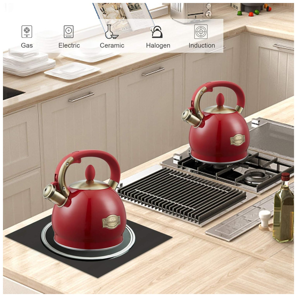 Materiais de alta qualidade Esta chaleira é feita de revestimento antiferrugem profissional e tecnologia de aço inoxidável, alta temperatura e resistência à corrosão, para garantir o desempenho antiferrugem do bule de chá do fogão. O aço inoxidável de grau alimentício de alta qualidade pode resistir a amassados e arranhões. Bule de chá 100 livre de PFOA, não tóxico e não desbotamento, proporcionando melhor proteção à saúde para sua família.