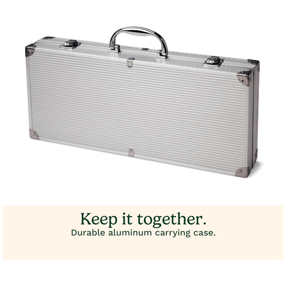 VINTE FERRAMENTAS ESSENCIAIS PARA GRELHAR Espátula de Chef, pinças para grelha, garfo digital de temperatura, escova de silicone para alinhavo, quatro pares de porta milho, cinco espetos, escova de limpeza com cabeça de escova extra estão todos contidos em uma maleta de alumínio durável perfeita para em qualquer lugar ou em casa.