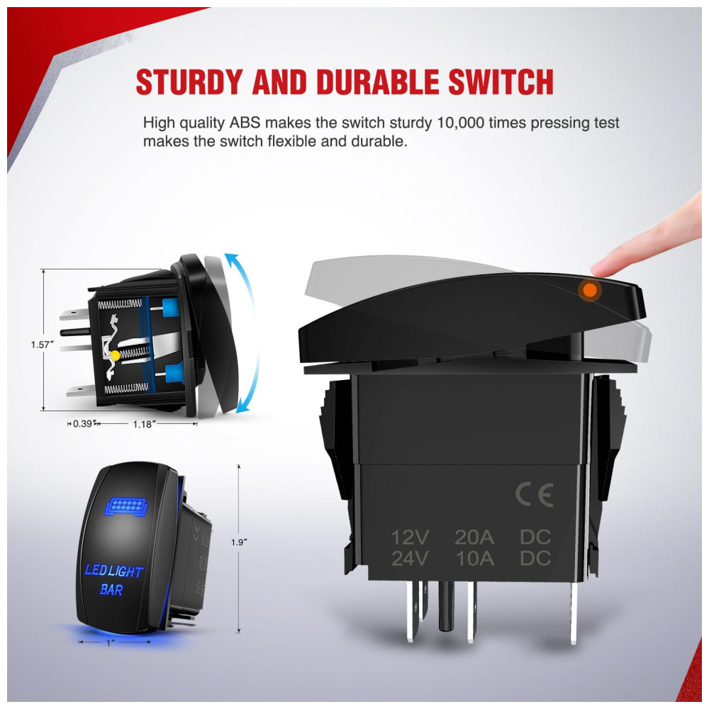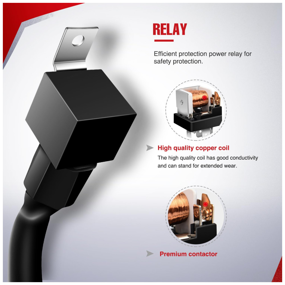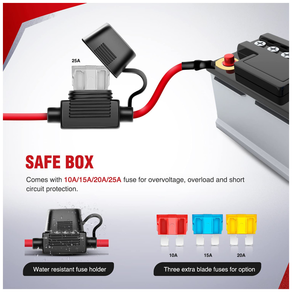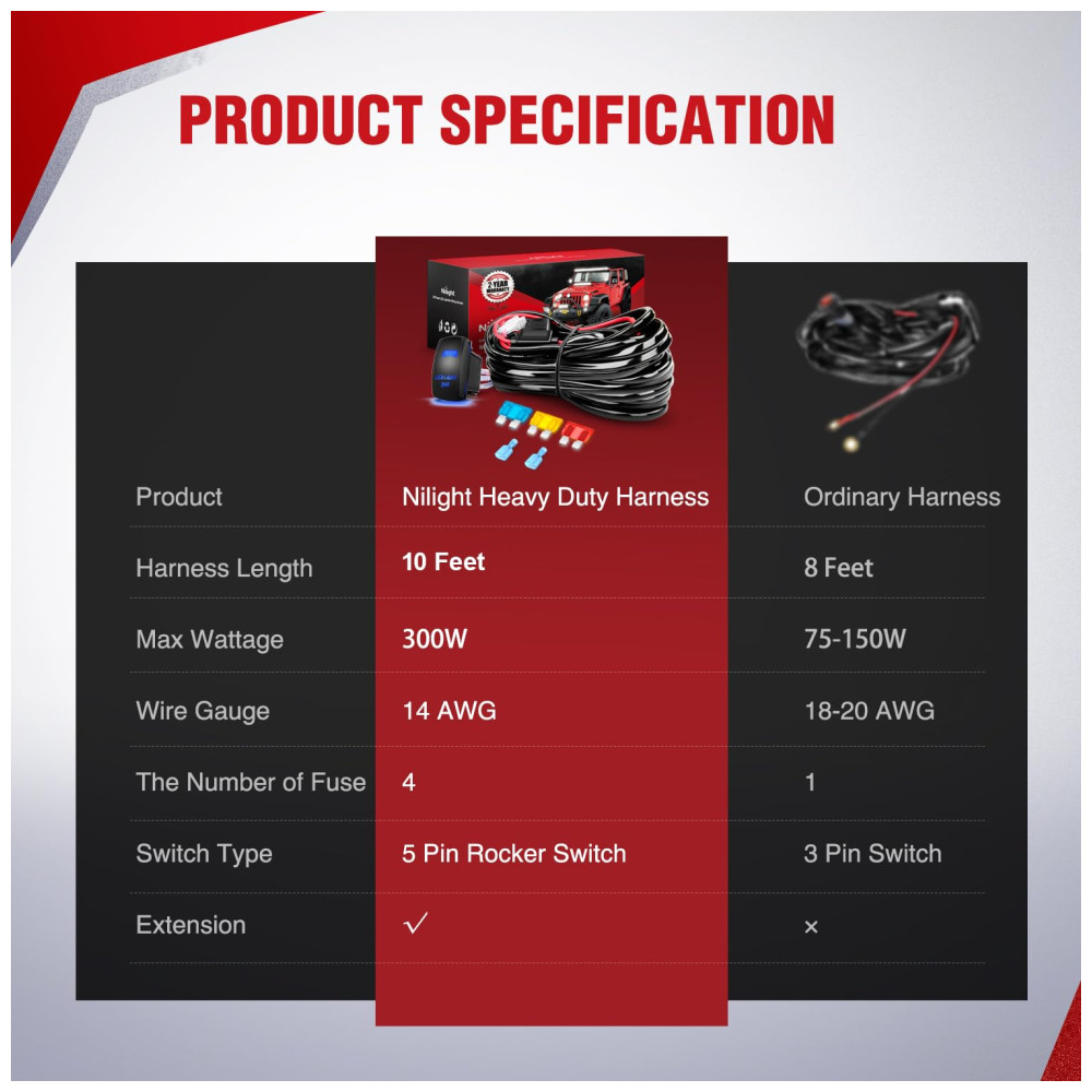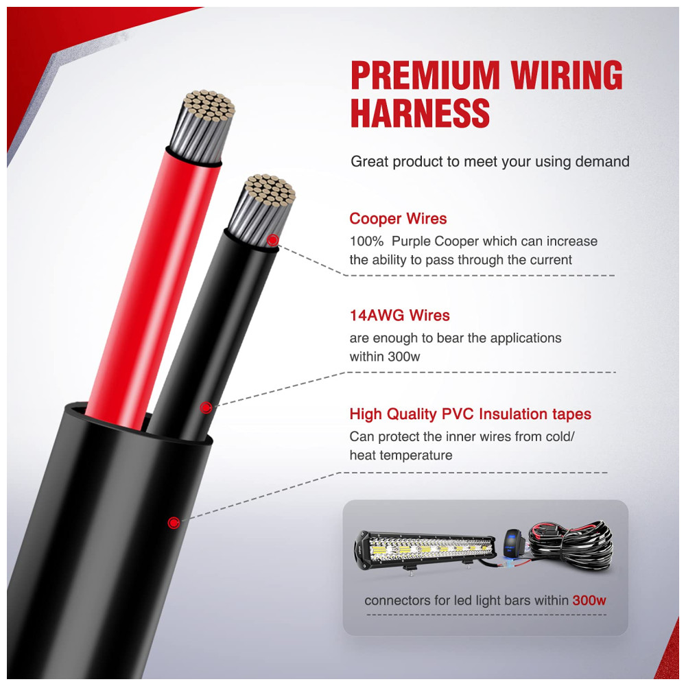 Qualidade Premium excelente condutividade elétrica excelente desempenho de flexão alta temperatura e resistência ao derretimento vida útil mais longa Fusível de proteção da lâmina o fusível em linha da lâmina evita sobrecorrente ou curto circuito Três fusíveis extras mais científicos e razoáveis Relé de potência confiável feito de materiais avançados e pinos bem condutores para garantir o circuito de proteção e conversão de segurança Interruptor durável interruptor basculante on off de 5 pinos de alta qualidade com padrão gravado a laser fácil de instalar e conveniente de usar O pacote inclui 1 kit de cabos 1interruptor de balancim LED de 5 pinos 1 manual de instrução Características do produto chicote elétrico de 3,6 m 1 bitola do fio 14AWG Potência máxima 300W Tensão operacional 12V DC Power Chave liga , desliga de 5 pinos Interruptor basculante de 12V DC Relé automotivo 12V DC Fusível de lâmina em linha adicionado três fusíveis extras para você finalize a instalação por profissionais ou instale o chicote elétrico sob a orientação de profissionais