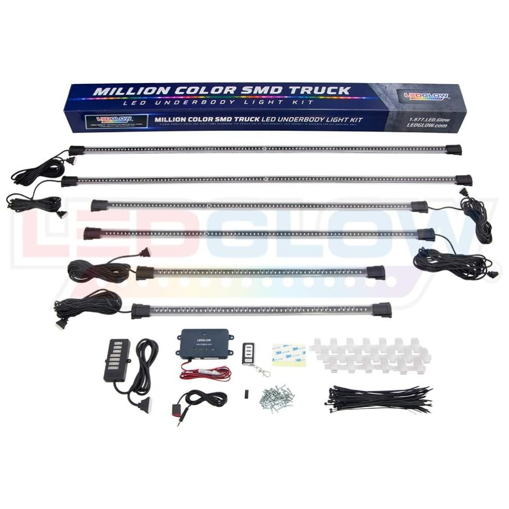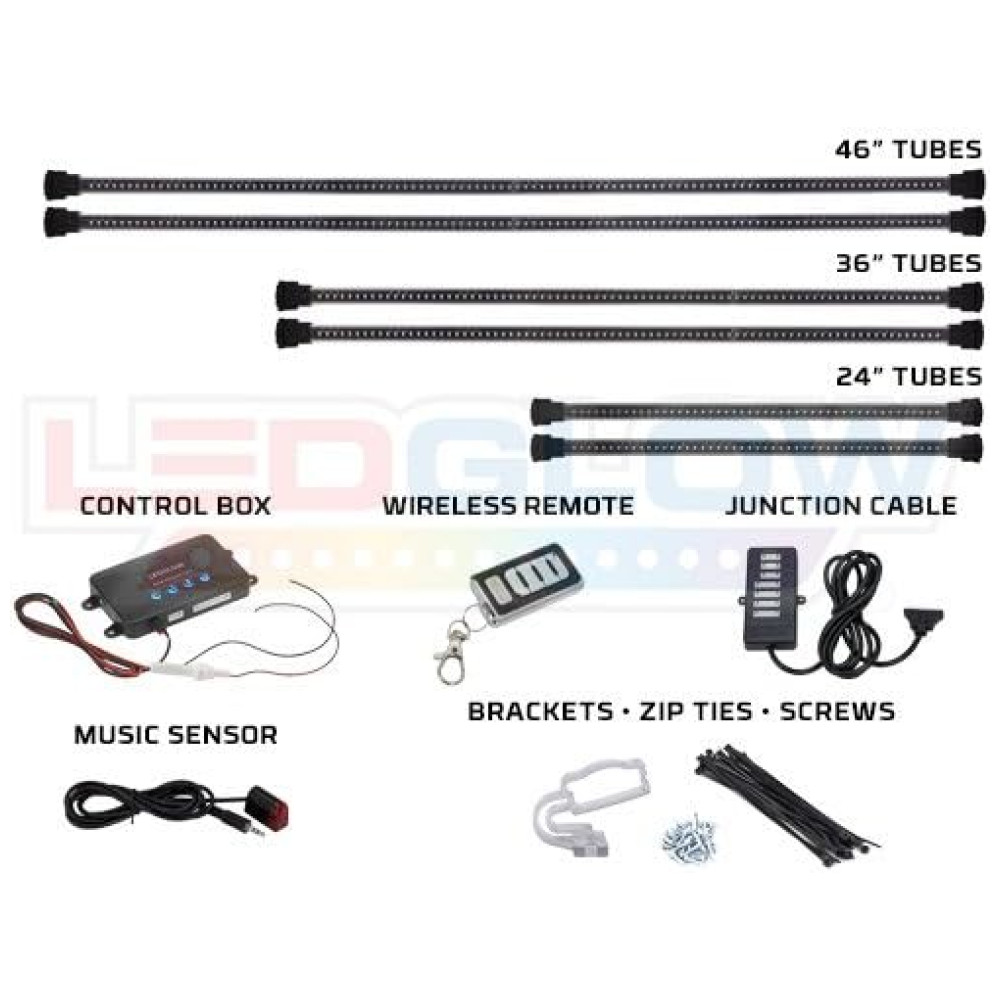 Adicione iluminação de realce de sublinhada de LED multicolorida ultra brilhante ao seu caminhão com 2 tubos de 1,15 m 2 tubos de 0,9 m e 2 da parte traseira resistentes à água de que alojam 474 LEDs SMD recomendados para caminhões com cabine e cabine estendida. Caixa de controle e recursos remotos sem fio 18 cores sólidas 12 padrões de iluminação exclusivos 5 modos de ativação de som 5 níveis de velocidade e 1 modo de ciclo de cores cores sólidas incluem azul vermelho verde laranja amarelo roxo rosa branco e azul petróleo verde claro azul claro violeta verde limão azul médio verde pálido azul bebê fúcsia e lavanda Inclui hardware de montagem e instalação como cabo de junção de tubo de 7 portas sob o corpo, sensor de música, suportes transparentes gravatas parafusos e instruções de instalação