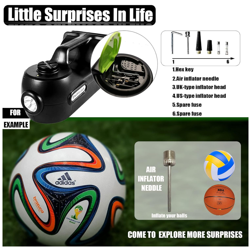 SURPRESA ESCONDIDA Uma mangueira de entrada de ar no macaco do carro pode fornecer gás suficiente para o pneu furado, você pode monitorar um pressão do pneu em um momento de qualificação gravada no LCD no macaco. Enquanto isso, este kit de tomate para carro elétrico de 5 toneladas de peso de outrora, para outros itens para outras finalidades. Por exemplo, uma agulha do inflador de ar pode ser usada para inflar futebol, basquete e etc. Mais surpresas merecem sua descoberta.