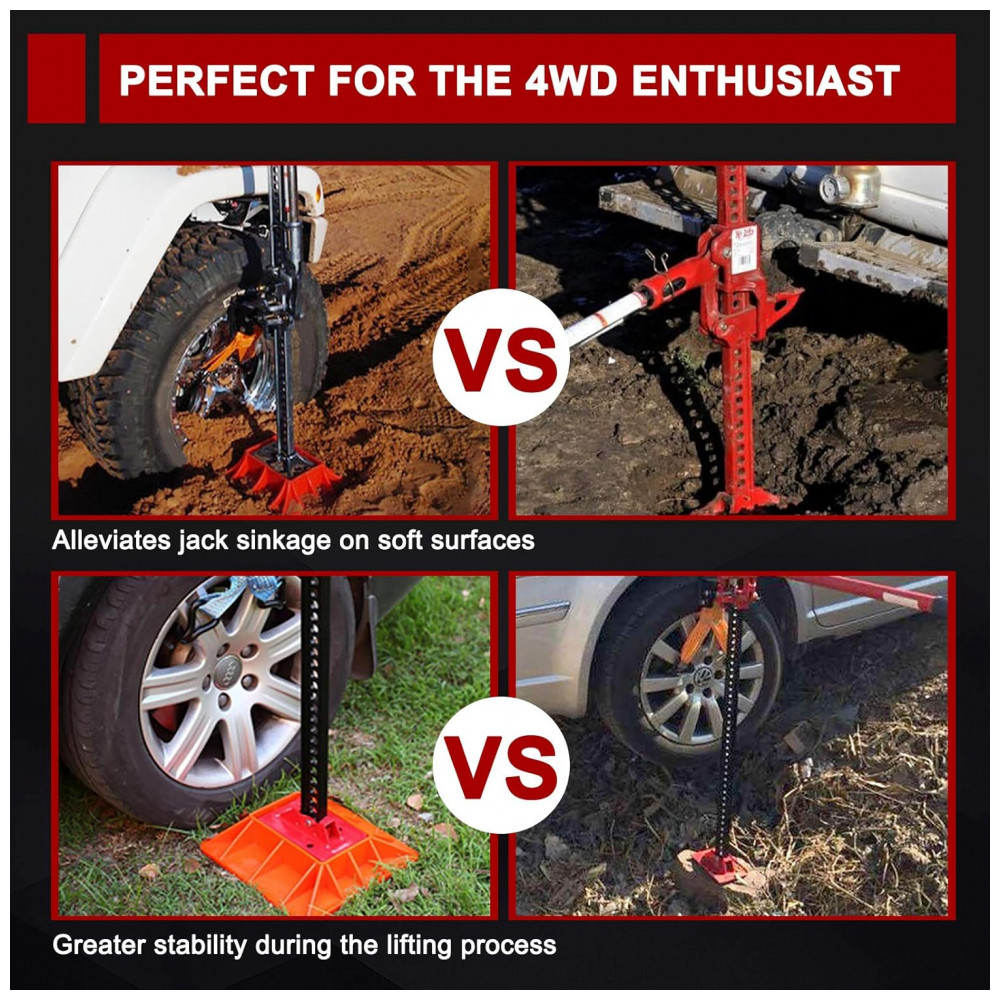 Base de macaco combinada e profissional: Projetada para aliviar o afundamento em superfícies macias, a base off road possui dentes serrilhados para raspar sujeira ou cascalho, criando uma superfície limpa e plana para a base assentar durante o uso. Possui um furo no centro para zenamento conveniente na barra do macaco