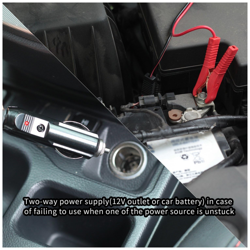 Perfeito para Sedan e SUV 2 cabeças levantadas removíveis são projetadas respectivamente para Sedan e SUV. Veículos com menos de 3 toneladas podem ser facilmente levantados, mas NÃO use em caminhões e acima de 3 toneladas. Fonte de alimentação bidirecional clipes de bateria com tomada 12V DC ou acendedor de cigarro em caso de falha de uso quando um dos a fonte de alimentação não está presa. Basta apertar o botão do controlador com linha longa o suficiente, conecta se à tomada de 12 volts do carro