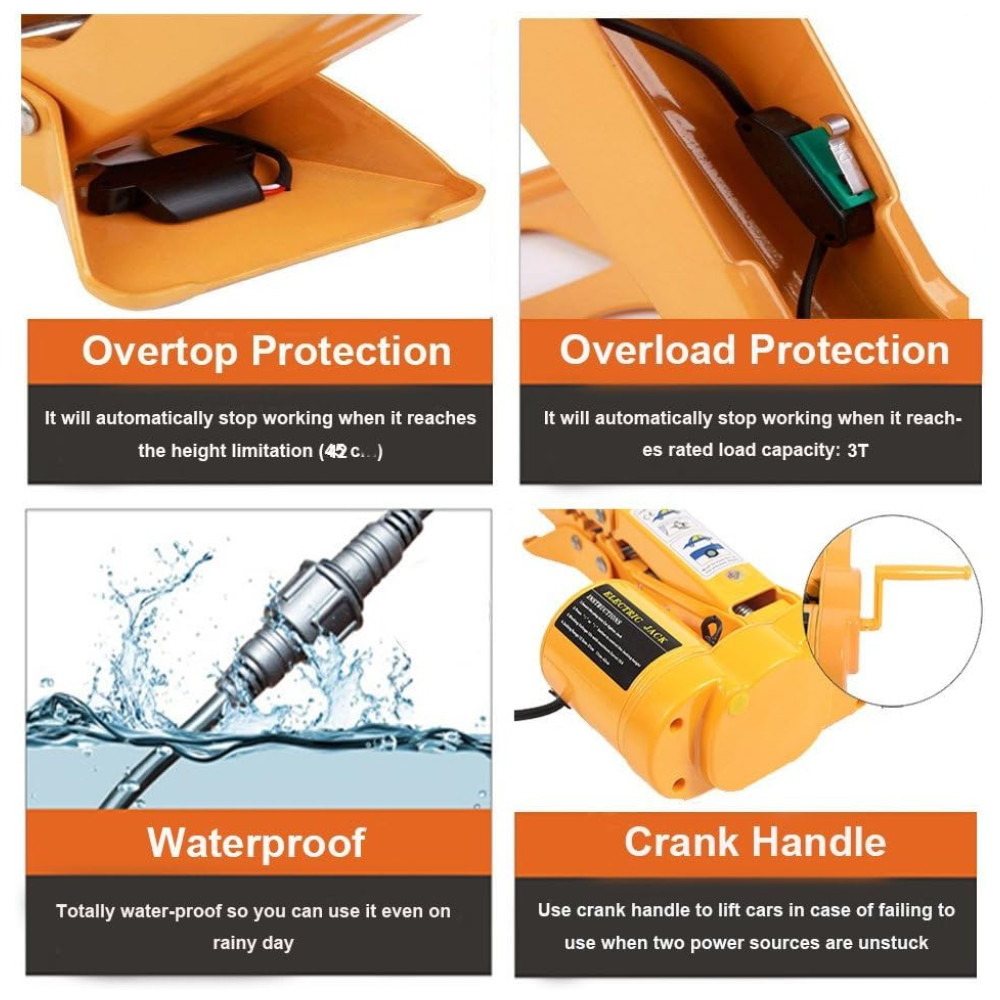 Maior estabilidade e segurança Nosso design de dente wtit plano de jack elétrico, tem uma placa de aço de espessamento resistente, corpo de pintura anti oxidação completo, que é antiferrugem, resistente ao desgaste. Base grande para superfície de contato maior e design de triângulo compacto para estabilidade extra, a haste de parafuso sólida reforçada faz com que o macaco do carro elétrico não seja facilmente rasgado ou torcido. Ele para de funcionar automaticamente quando atinge o limite de altura