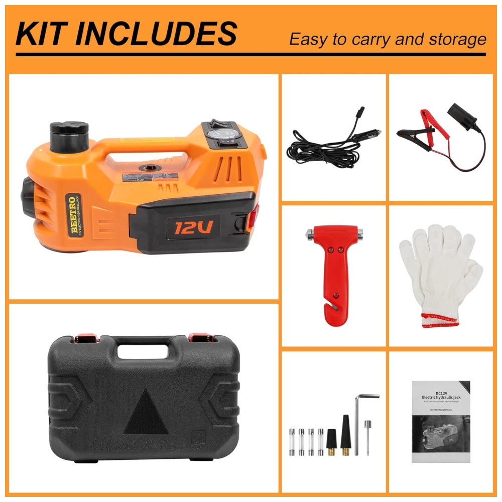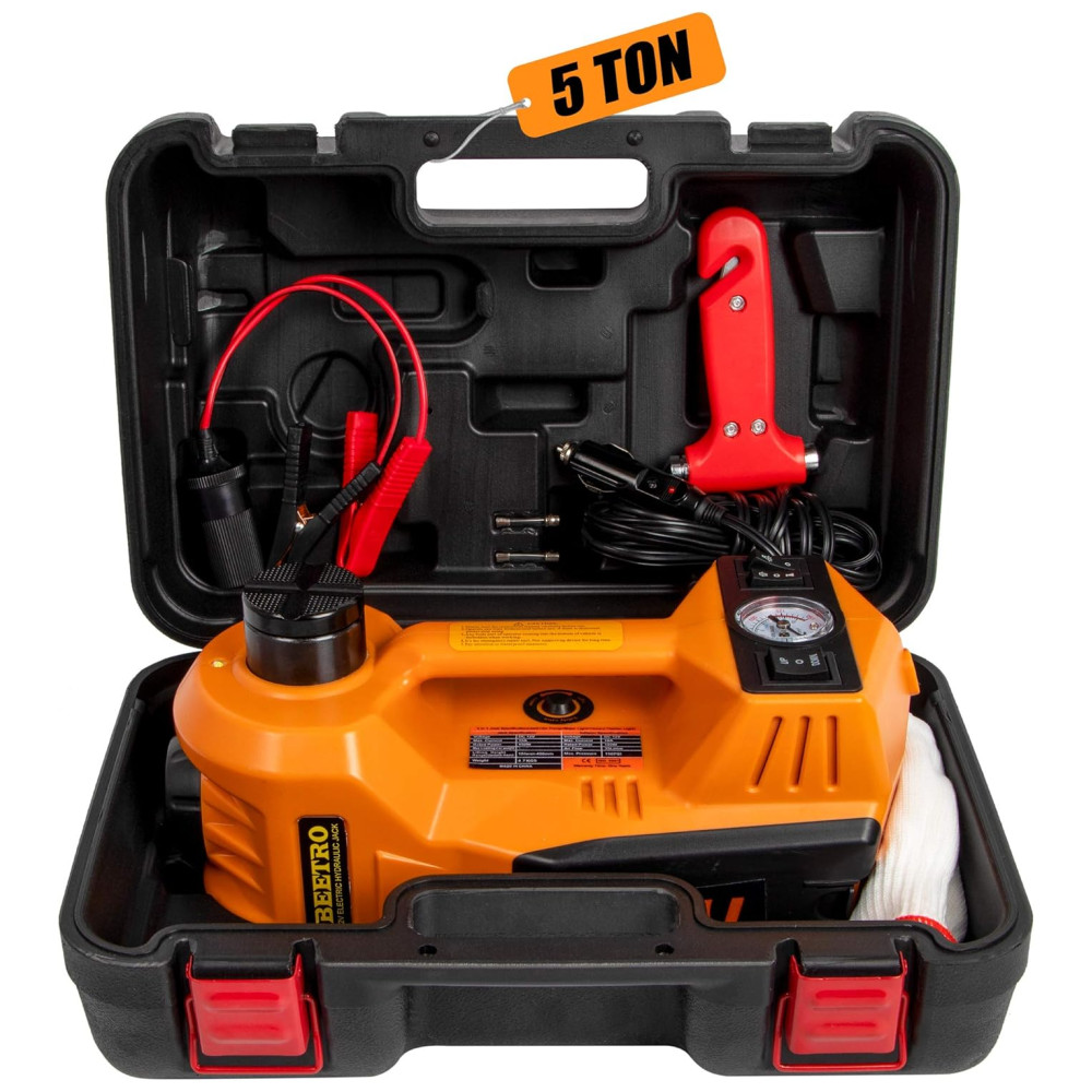PROJETO 3 em 1 O macaco elétrico hidráulico BEETRO tem 3 funções, macaco hidráulico de 5 toneladas, bomba infladora de pneus e lanterna embutida, atende às suas necessidades de troca de pneu ou bombeia o pneu em caso de emergência. Adequado para a maioria dos veículos com menos de 5 toneladas, Sedan, SUV, MPV, Caminhão, etc. É um bom ajudante essencial para garagens, fazendas, rodovias, viagens de longa distância ou substituição de pneus de emergência na estrada.