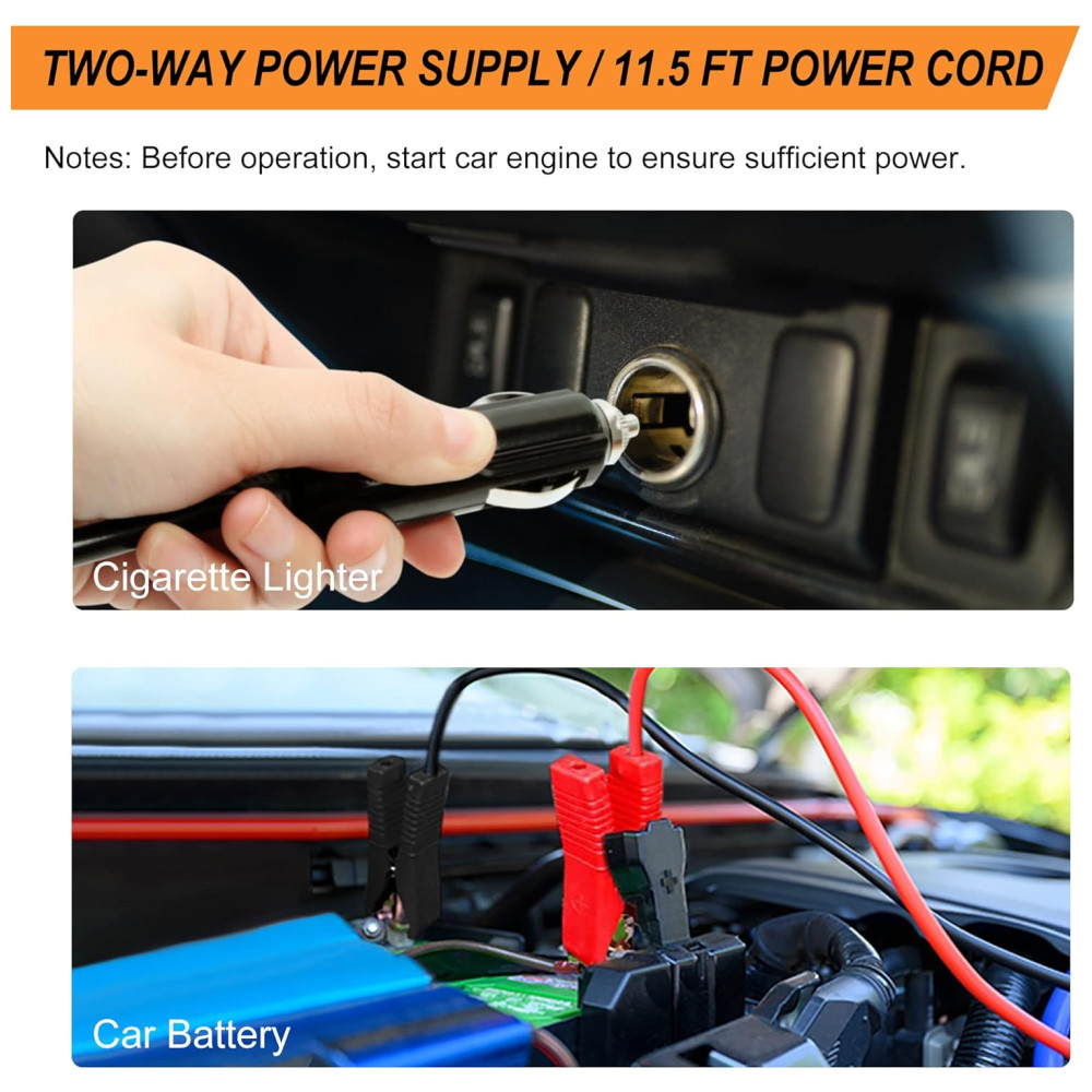 FONTE DE ALIMENTAÇÃO UNIVERSAL Pode ser conectado a uma tomada de isqueiro ou bateria de carro e possui um longo cabo de alimentação de 3,5 metros para que você possa colocá lo no pneu dianteiro ou traseiro. Além disso, vem com lanterna embutida e caixa de ferramentas à prova de quedas, não se preocupe em trabalhar à noite ou perder acessórios. O triângulo vermelho na superfície da caixa de ferramentas pode ser como um sinal de aviso na estrada durante reparos na rodovia.