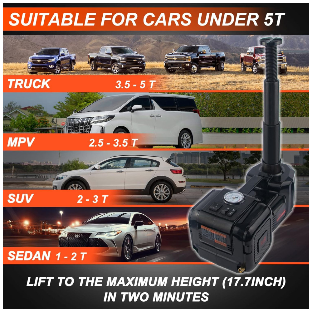 Aplicado universal O macaco hidráulico do carro possui duas formas de alimentação clipe de bateria com tomada 12V DC e isqueiro. O motor de alta potência quase corresponde a todos os veículos do , sedan, SUV, MPV, caminhão, picape. Além disso, você pode usar o macaco do carro em sua motocicleta ou alguns outros itens pesados. Certifique se de operar com cuidado em terreno plano e que o peso da carga nunca exceda seu MAX.