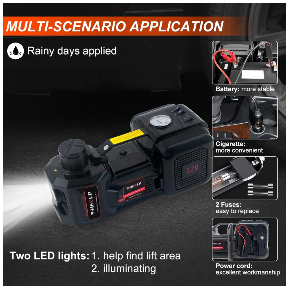 Aplicação em várias cenas Este macaco hidráulico portátil é aplicado na garagem de sua casa, viagem, oficina mecânica, fazenda ou emergência intermediária. A tomada do carro e os conectores do cabo de alimentação são à prova dágua, fique à vontade para usar em dias chuvosos. Além disso, duas luzes LED ajudam a encontrar a área do elevador e iluminam o ambiente de trabalho, mesmo na meia noite escura