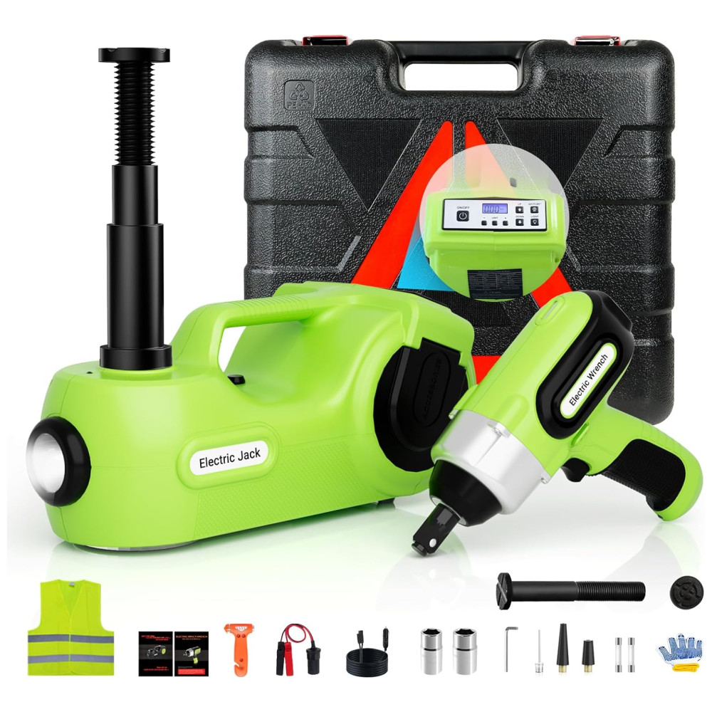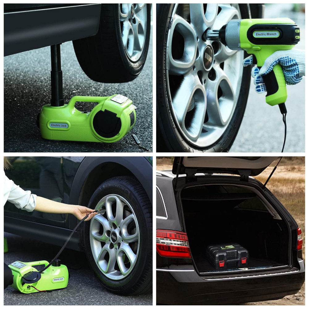 Kit de reparo do carro móvel Macaco hidráulico elétrico de 5 toneladas, insuflador de pneus e chave de impacto, tudo em um estojo de ferramentas, atendem a todas as suas necessidades de troca de pneus ou bombeamento de pneus. Alimentado por acendedor de cigarros ou bateria de carro, totalmente automático, economize tempo e energia campare com tomada de carro maual. Ótima opção para ser guardado no porta malas de um carro para situações de emergência.