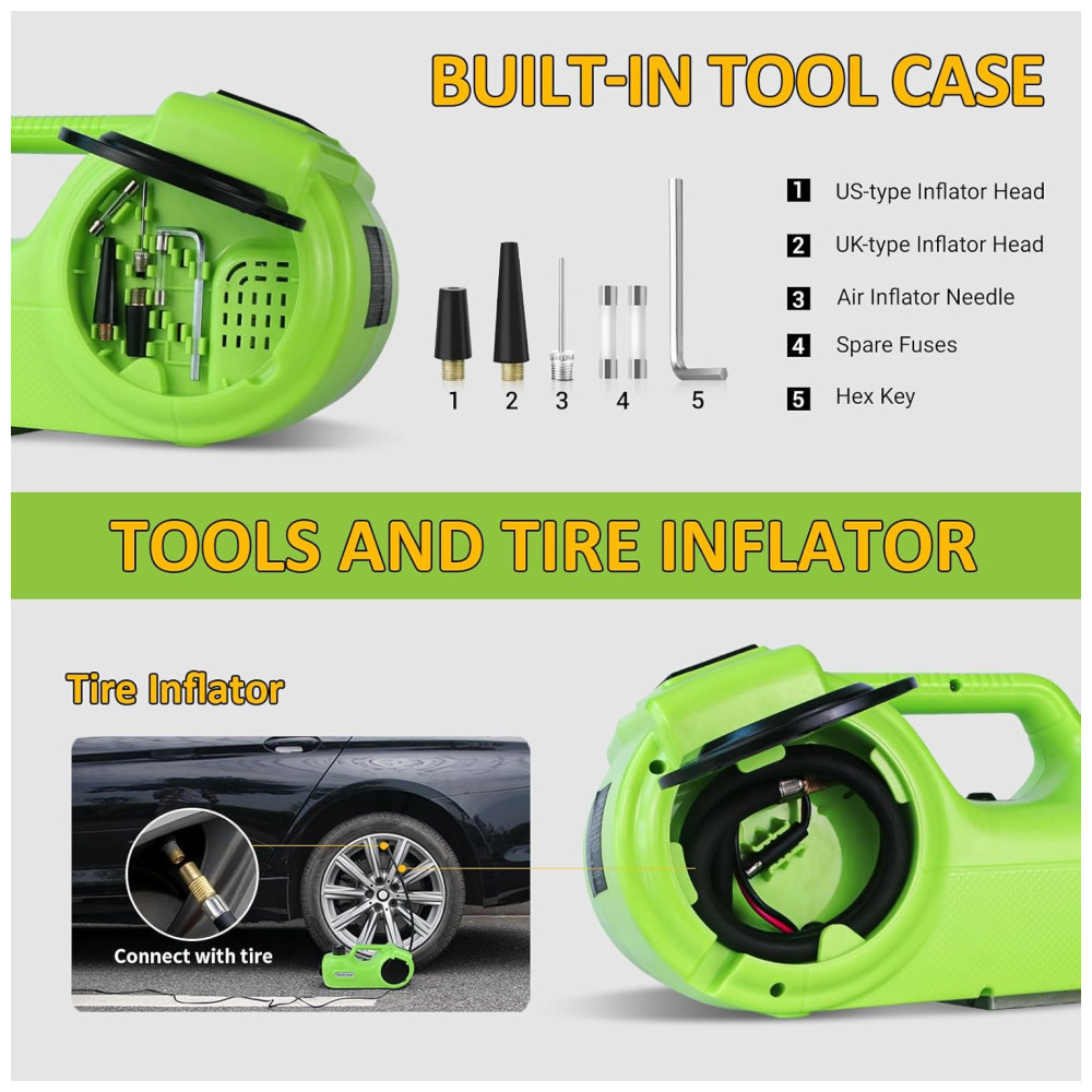 Inflator de pneu portátil Um inflador de bombeamento de pneus de 150 PSI é instalado no macaco de chão, equipado com display digital de pressão. Este compressor de ar portátil de 12V produz um fluxo de 35L , min. Equipado com várias cabeças adaptadoras, pode não só inflar o carro, mas também ser para bicicletas, balões, brinquedos infláveis, etc.