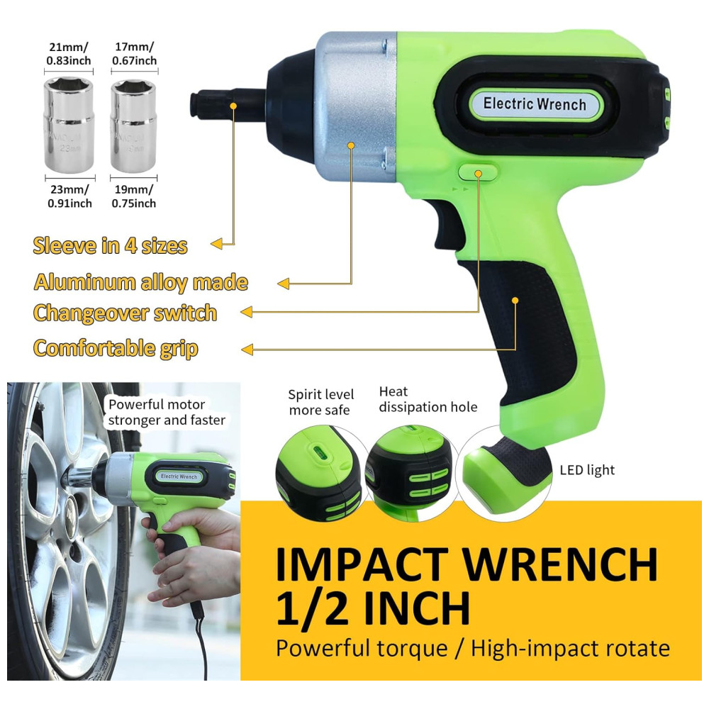 Chave de impacto elétrica Este kit de tomada de carro elétrico 12 V DC inclui uma chave de impacto elétrica portátil de com duas luvas de quatro tamanhos, combinando com a maioria dos veículos. Torque máximo 420 NM