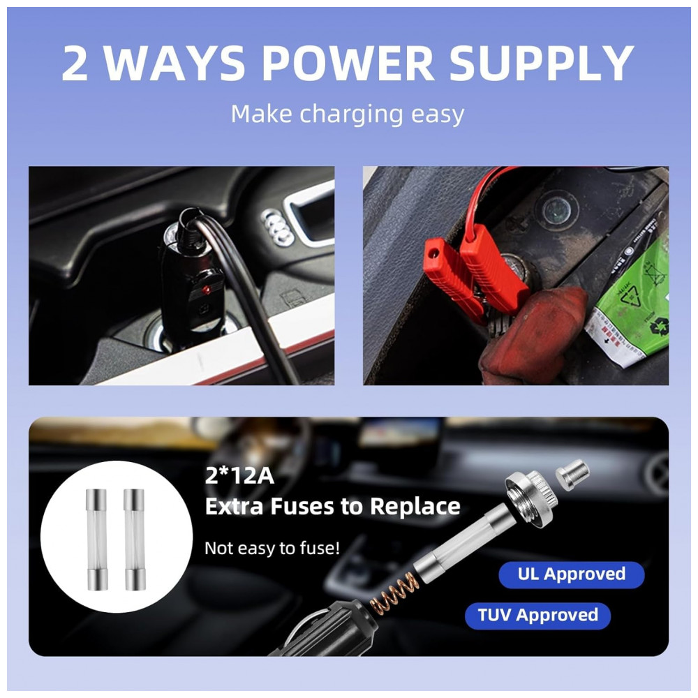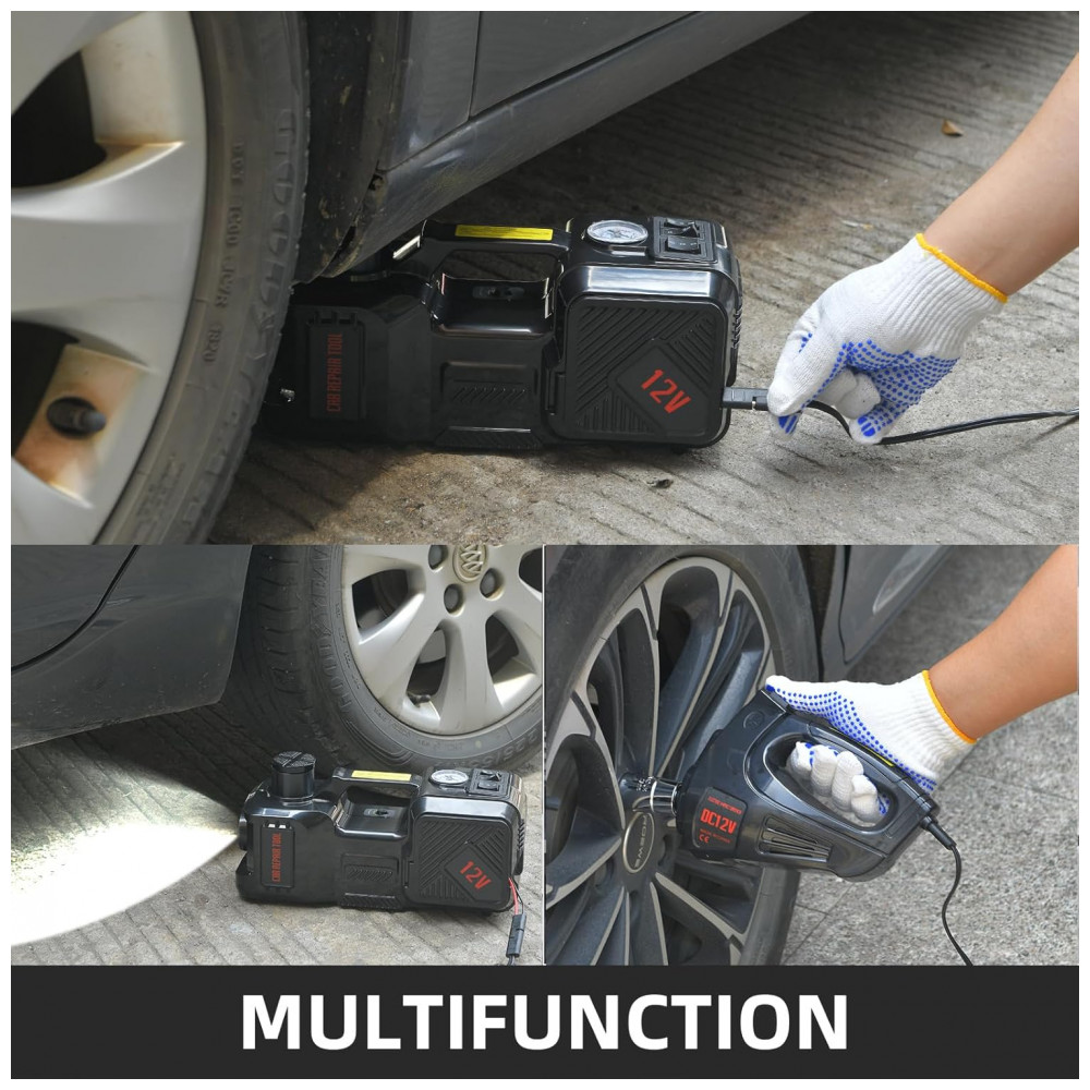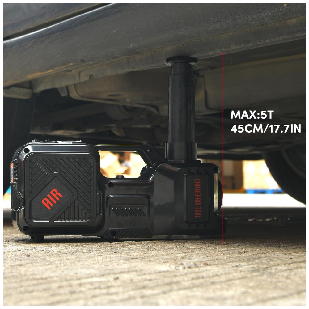 O kit inclui macaco elétrico, chave de impacto elétrica, estojo de plástico, cabo de energia de 3,5m, braçadeira de bateria com fio, par de luvas e manual do usuário, entre outros. Este kit tem tudo que você precisa para emergências na estrada e é muito conveniente também para uso doméstico. O nosso macaco elétrico é acionado por sistema hidráulico. Após conectar, ele pode elevar veículos de até 5 Toneladas em menos de 2 minutos até sua altura máxima de elevação de 45 cm. O poderoso macaco hidráulico se adequa a quase todos os carros, sedans, SUVs, MPVs, picapes e caminhões, sendo mais competitivo do que outros macacos automotivos. Multifuncional, este macaco elétrico vem com bomba de ar automática e uma luz LED brilhante embutida. Assim, atende às necessidades de diversos ambientes. Mesmo iniciantes podem usá-lo facilmente. Para garantir máxima segurança, o macaco elétrico para automaticamente de funcionar ao atingir seu limite de altura. Este conjunto de macaco elétrico atende a várias demandas, tornando-se uma ferramenta essencial ao ar livre em caso de emergência. Observações: Ligue o motor do carro antes da operação. NUNCA USE O MACACO EM SUPERFÍCIES INCLINADAS OU EM VEÍCULOS ACIMA DE 5 TONELADAS.