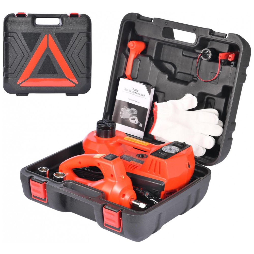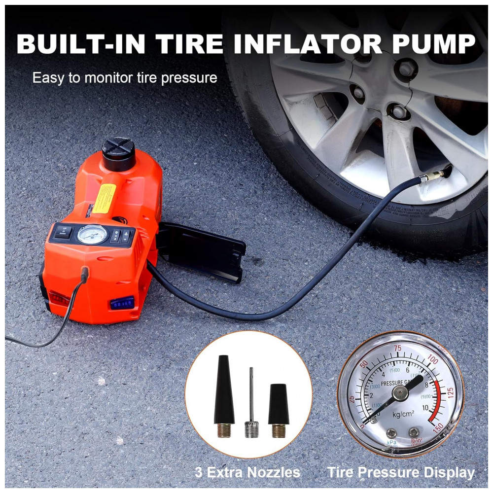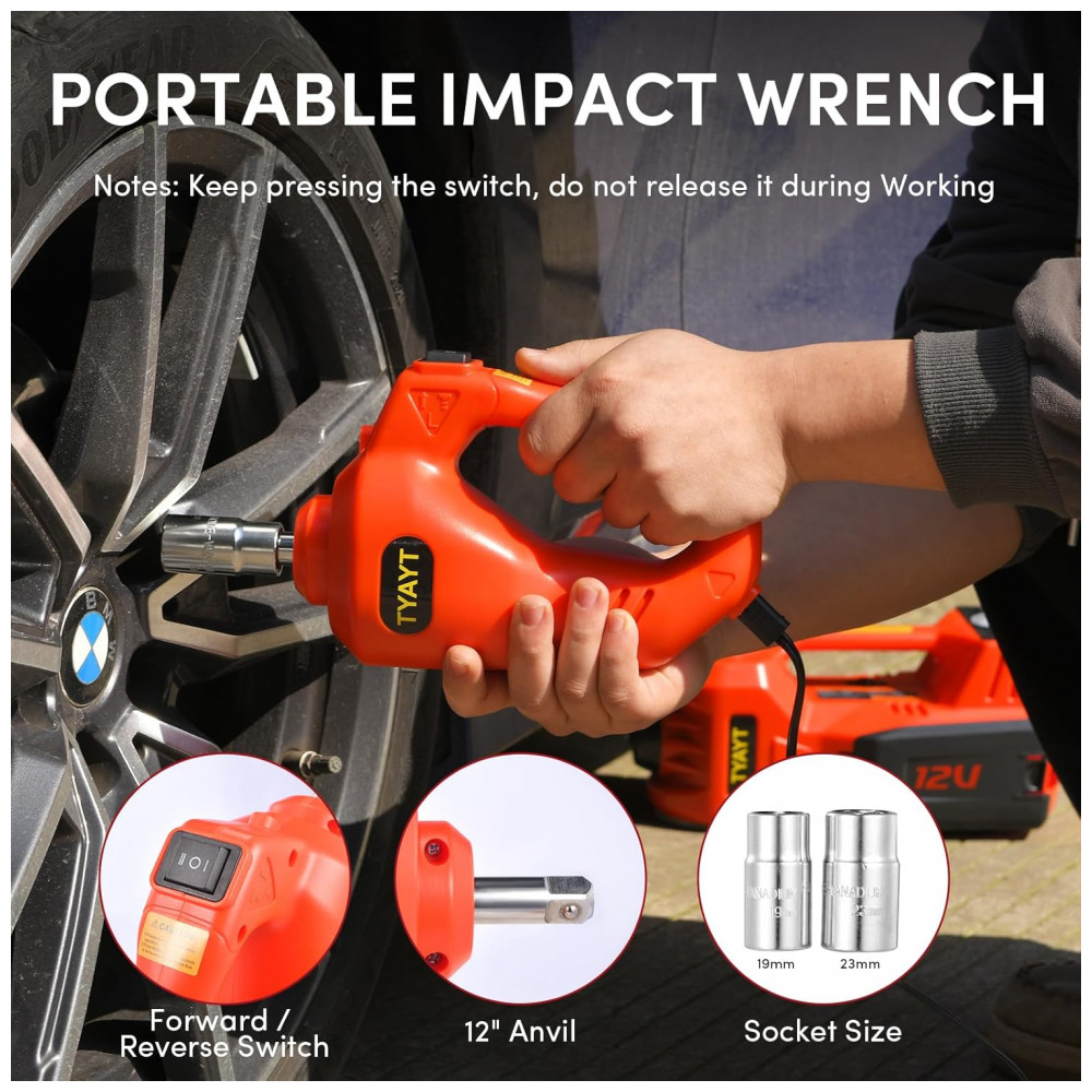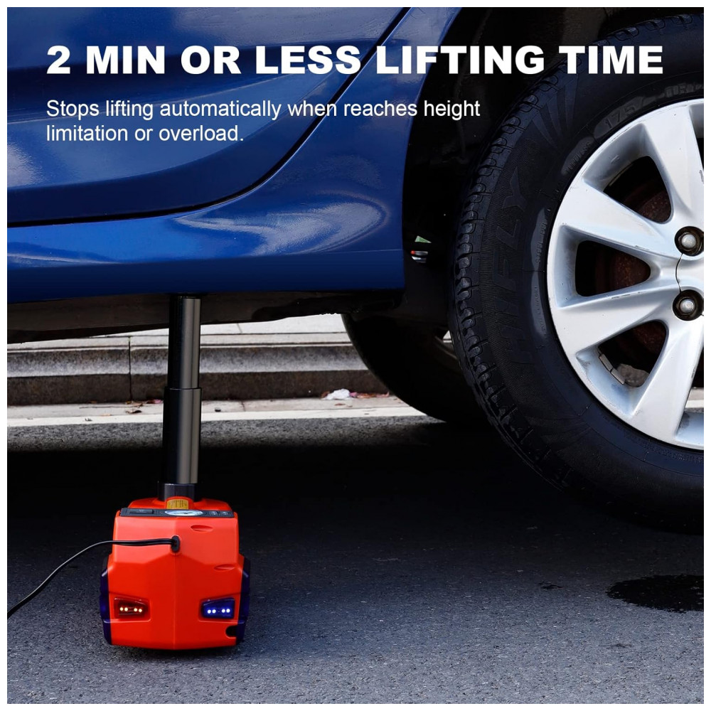 O Macaco Elétrico Hidráulico TYAYT é potente e portátil, capaz de elevar veículos de até 5 toneladas em menos de 2 minutos para seu alcance máximo de 1570 centímetros. Este macaco hidráulico poderoso atende praticamente todos os tipos de automóveis, sedãs, SUVs, MPVs, picapes e caminhões, sendo mais competitivo do que outros modelos. Com um motor DC lubrificado permanentemente, o macaco elétrico para automaticamente de funcionar ao atingir a altura máxima ou em caso de sobrecarga, garantindo estabilidade e segurança. Acompanha uma chave de impacto elétrica ergonômica e portátil, facilitando a troca de pneus com rapidez. Este kit 4 em 1 inclui ainda uma bomba de ar, luz LED e luz de aviso, atendendo a todas as suas necessidades de substituição de pneus de uma só vez.