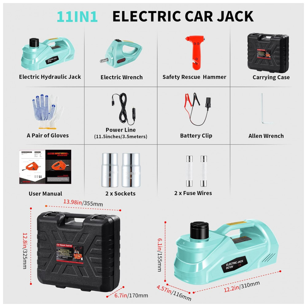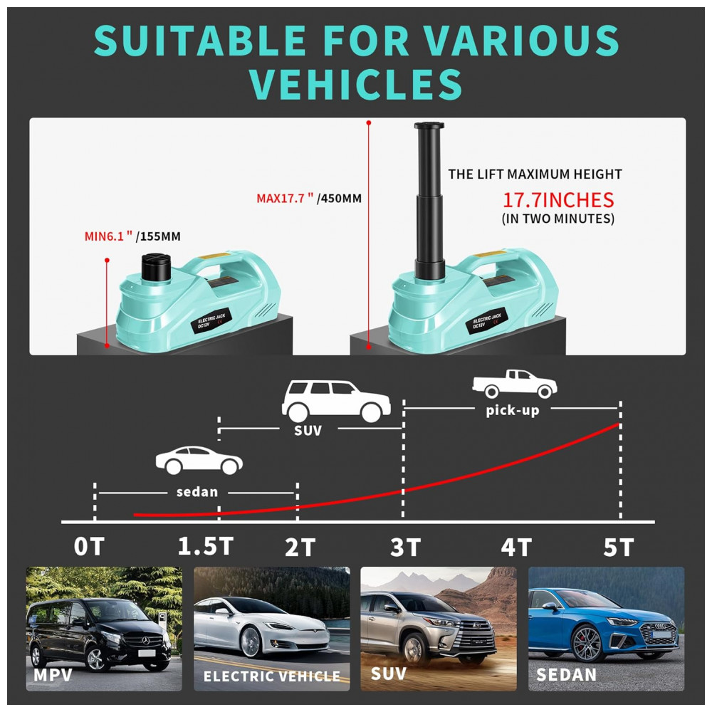 Com capacidade de elevação poderosa, este macaco elétrico para carro de 5 toneladas pode facilmente levantar até 11023 LBS, tornando-o ideal para SUVs, MPVs, sedans e caminhões. Este gato elétrico para carro garante uma experiência confiável e eficiente na troca de pneus. Acompanhado de uma chave de impacto elétrica, o macaco elétrico para carro facilita a remoção e aperto das porcas de roda. Essencial para qualquer kit de reparo de veículos, proporciona trocas de pneus rápidas e seguras. Com uma ampla faixa de elevação de 6,1 a 17,7 polegadas, este macaco elétrico para carro 5 toneladas 12v acomoda diversas alturas de veículos, oferecendo flexibilidade para diferentes situações de troca e reparo de pneus. O kit completo inclui tudo o necessário para trocas e reparos de pneus. Sendo uma solução abrangente para caminhões, combina as funções de um macaco elétrico de chão e um conjunto de ferramentas eficiente. Além disso, possui sistema de proteção contra sobrecarga que interrompe automaticamente o processo de elevação ao atingir a altura máxima ou sobrecarregar.