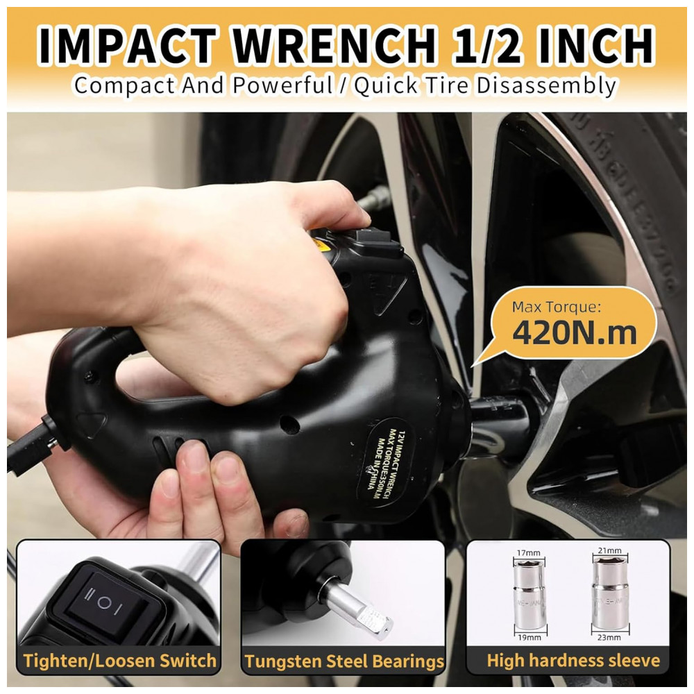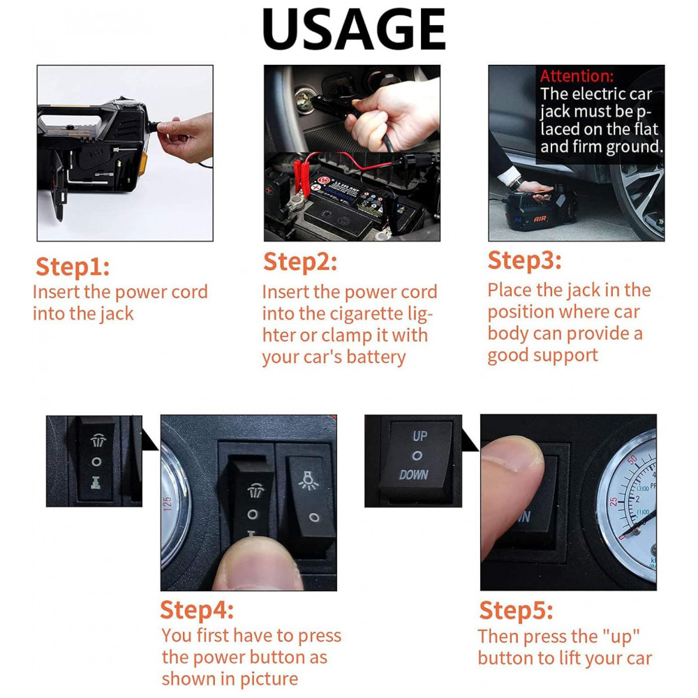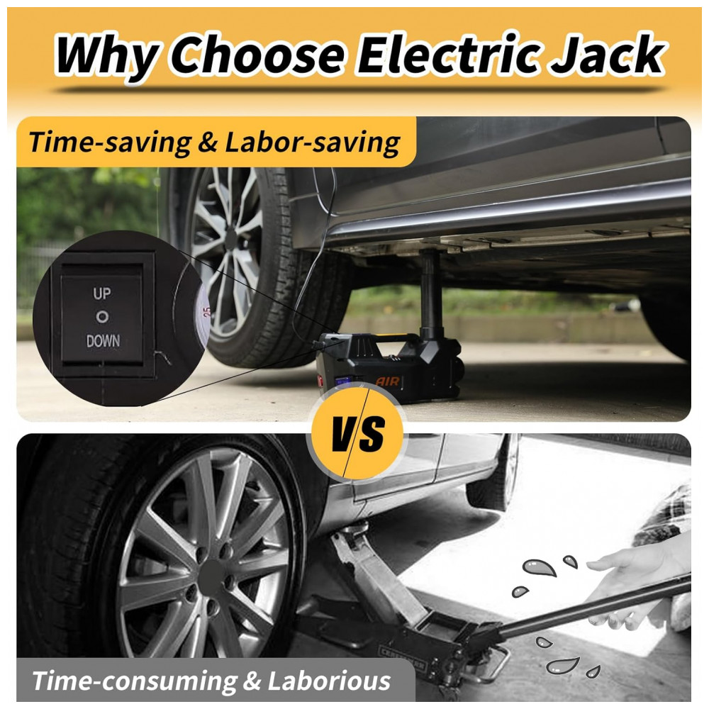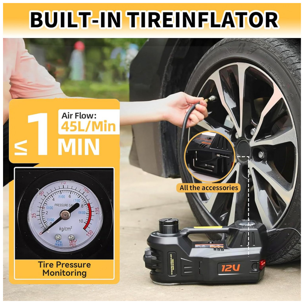 O Macaco Elétrico ROGTZ de 12V economiza tempo, elevando veículos de até 5 toneladas a uma altura de 45 cm em apenas 60 segundos. Com alta eficiência hidráulica, supera os macacos manuais. Seu motor potente atende sedans, SUVs e caminhões. Fácil de usar, até mesmo usuários iniciantes podem elevar com confiança. Acompanha Chave de Impacto para Troca Rápida de Pneus, com 350Nm, soquetes de 17-19mm e 21-23mm, compatível com a maioria das porcas de rodas. O motor de baixo ruído permite remover rapidamente as porcas. Acoplada ao macaco elétrico em um estojo compacto para uso rápido e organizado. Solução Completa para Inflar Pneus, com bomba de ar embutida inflando pneus de carros padrão em 2 minutos. Manômetro em tempo real garante inflação precisa. Inclui várias bicos para carros, bicicletas e motocicletas. Uma ferramenta versátil para a manutenção de pneus a qualquer momento. Kit de Ferramentas Versátil para Reparos de Carros, este kit de macaco portátil vem em uma caixa durável contendo soquetes, bicos de ar, luvas, etc. O triângulo vermelho no estojo serve como sinal de aviso. Uma solução completa e conveniente para a troca de pneus.