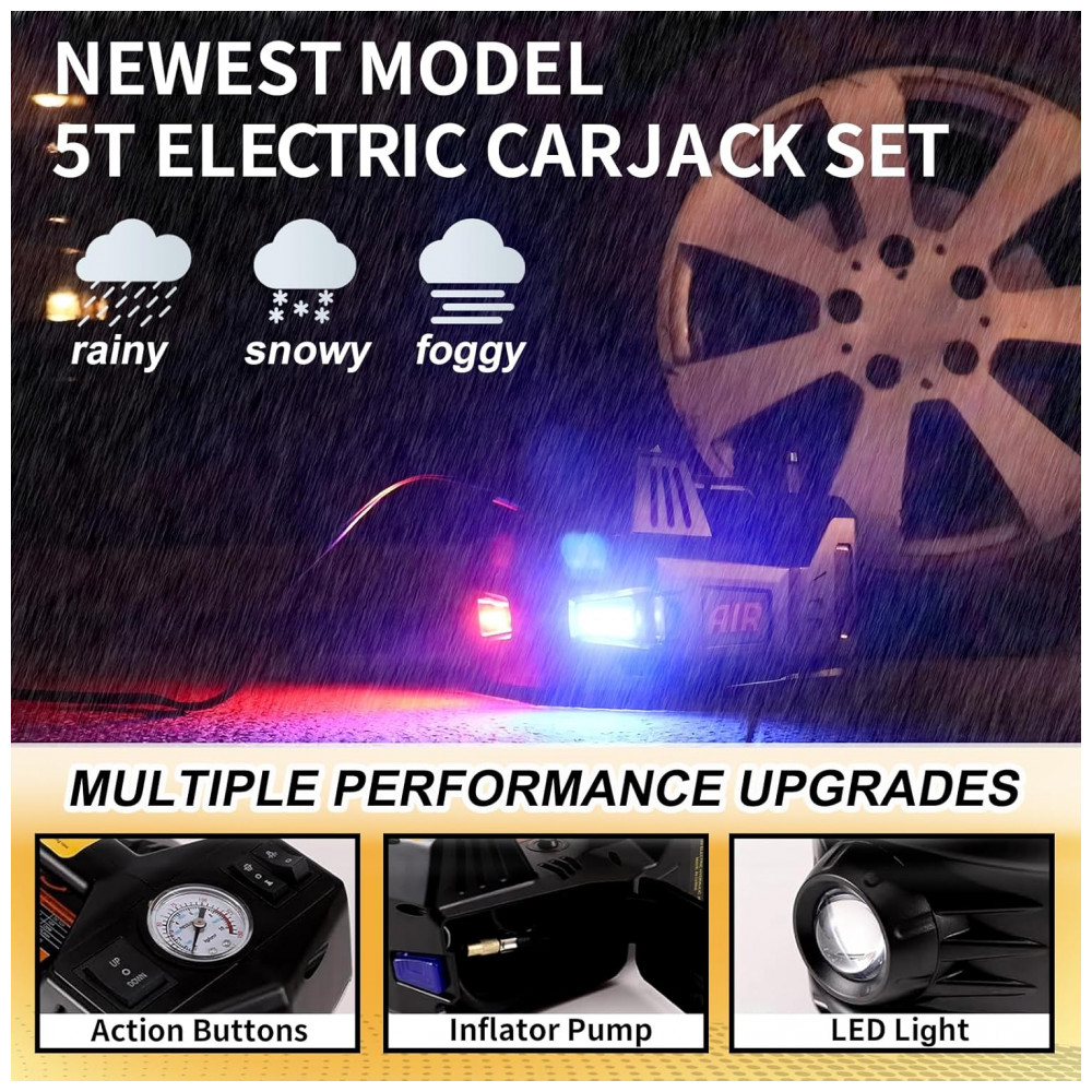 Macaco Hidráulico Elétrico ROGTZ 5 Toneladas 12V – Elevação Portátil de 45 cm com Chave de Impacto e Bomba Infladora de Pneus para Reparo de Carros