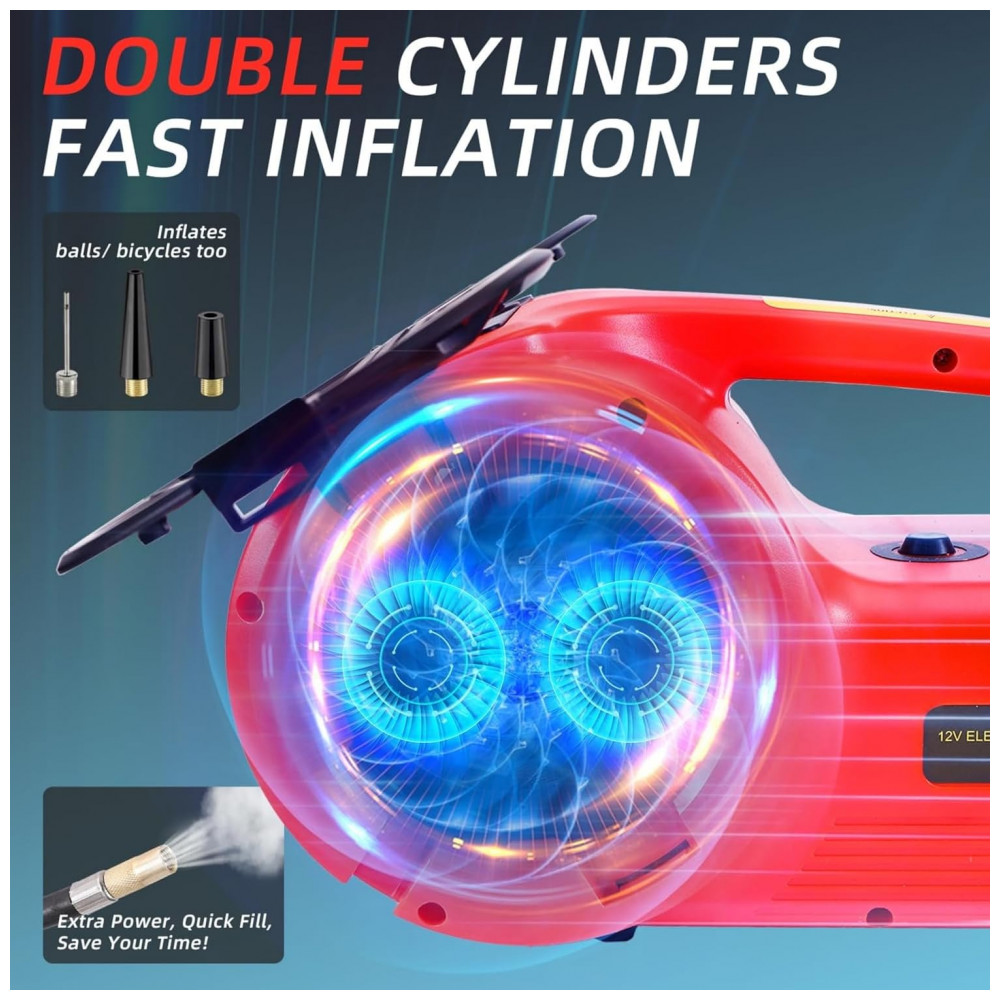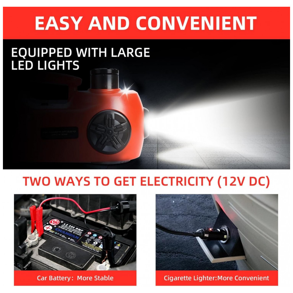 Com acionamento automático com um toque, este macaco elétrico de duplo motor eleva veículos de até 5 toneladas em apenas 60 segundos! Com 53cm de altura, supera os concorrentes. Operação simples com um botão, permitindo até mesmo iniciantes trocarem pneus sem esforço. Design portátil e seguro com corpo leve de ABS e base de alumínio antideslizante para estabilidade no chão. Possui travamento automático de altura e proteção contra sobrecarga. Luzes de LED à prova d’água garantem operação segura em emergências de chuva ou à noite. Kit de emergência completo que inclui caixa reflexiva com martelo de segurança, fusíveis sobressalentes, soquetes, luvas, entre outros. Ideal para emergências na estrada, ajudando a trocar rapidamente os pneus ou lidar com quebras, com todas as ferramentas organizadas e acessíveis. Chave de impacto aprimorada para troca rápida de pneus, removendo porcas em segundos com 350NM de torque. Inclui soquetes de 17-23mm para sedãs, SUVs e caminhões. Essencial para emergências na garagem ou estrada. Sistema eficiente de inflação de pneus, integrando bomba de ar que infla os pneus do carro para 35 PSI em menos de 2 minutos. Manômetro de pressão em tempo real garante monitoramento preciso. Inclui 3 bicos para carros, bicicletas, motos e equipamentos esportivos.
