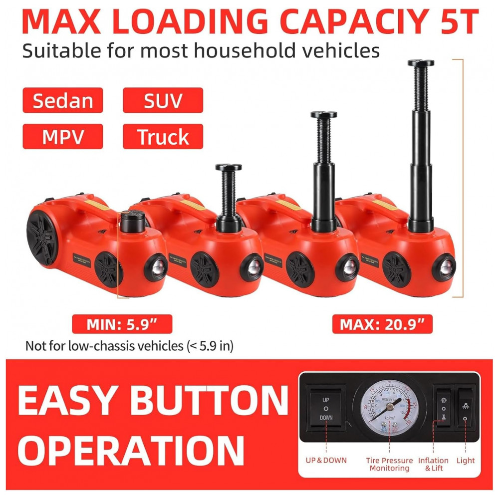 Macaco Hidráulico Elétrico ROGTZ Atualizado 5 Toneladas 12V – Elevação Portátil de 53cm com Chave de Impacto e Inflador de Pneus para Reparo de Carros