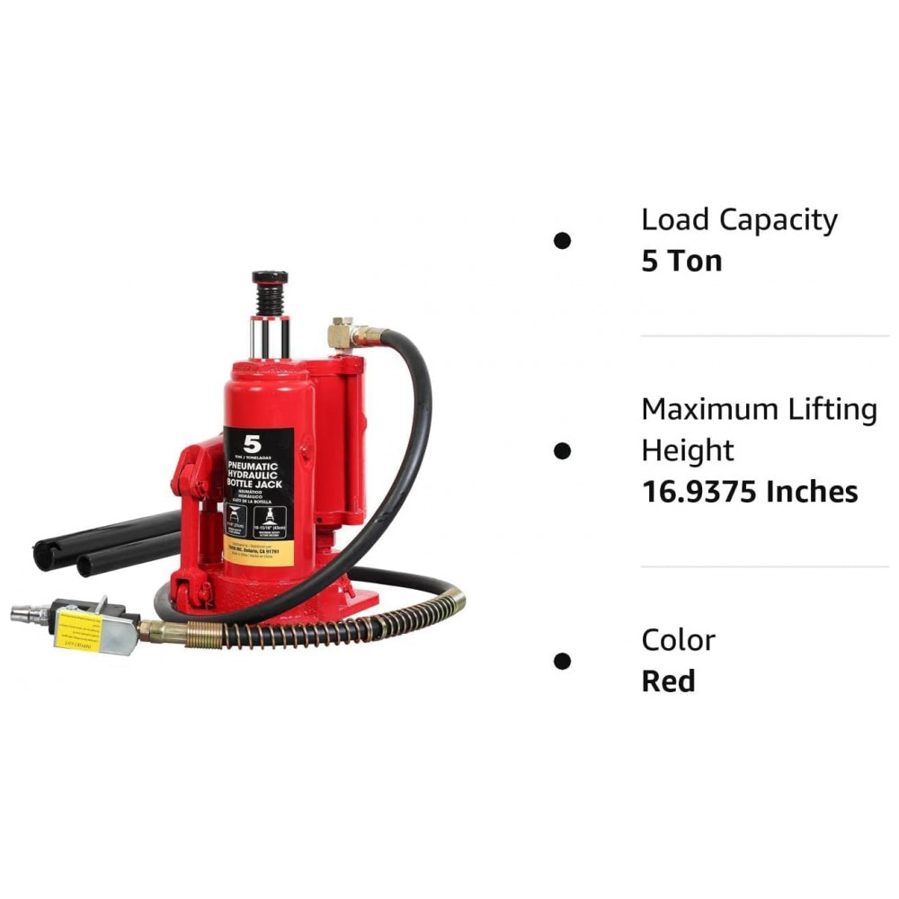 Este macaco hidráulico pneumático tem 5 toneladas e a faixa de elevação é de aproximadamente 21,0 a 43,0 centímetros . A pressão do ar de trabalho varia de aproximadamente 100 a 175 PSI