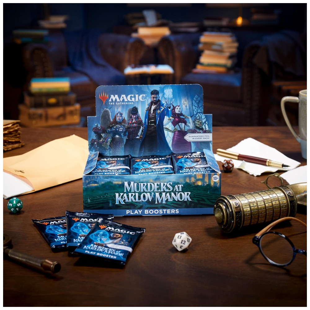 Uma série de assassinatos chocantes envolvendo alguns dos cidadãos mais poderosos de Ravnicaroit tem a cidade à beira do caos. Agora, detetives estão no caso… e você é um deles. Retorne ao plano favorito dos fãs de Ravnica em Assassinatos na Mansão Karlov, onde Magicilitis assume o gênero de mistério do assassinato. Este Murders at Karlov Manor Play Booster Box contém 36 Play Boosters, perfeitos para jogos limitados e diversão na abertura de pacotes. Cada Play Booster contém 14 cards de Magic: The Gathering e 1 card de Token/Anúncio, card de Suspect Punchout ou Art Card. (Cartões de Arte Regular encontrados em 30% dos pacotes. Cartões de Arte de Assinatura com estampa em folha em 5%.) Cada pacote inclui uma combinação de 1 a 4 cartas de raridade Rara ou superior, 3 a 6 cartas de Padrão, 6 a 9 cartas Comuns e 1 carte de Terreno (com Terrenos de Arte Completa em 33% dos pacotes). Um card de qualquer raridade é em Folha Tradicional. O card de Terreno também é em Folha Tradicional em 20% dos boosters, e um card especial de bônus da história de Magicilitis pode ser encontrado em 12% dos pacotes. Livro de regras não incluído.