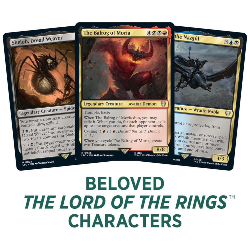Nota importante: Este produto não contém as cartas de Anel Serializado, incluindo as versões serializadas de Elfo, Anão ou Humano Sol, e o Anel 1 de 1 (Serializado 001 de 001). Estas cartas raras só podem ser encontradas em alguns boosters de colecionador de O Senhor dos Anéis: Contos da Terra Média. No entanto, as cartas de anel não serializadas incluídas são mecanicamente idênticas às suas versões serializadas.
