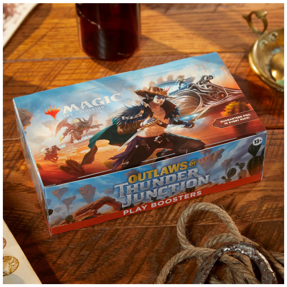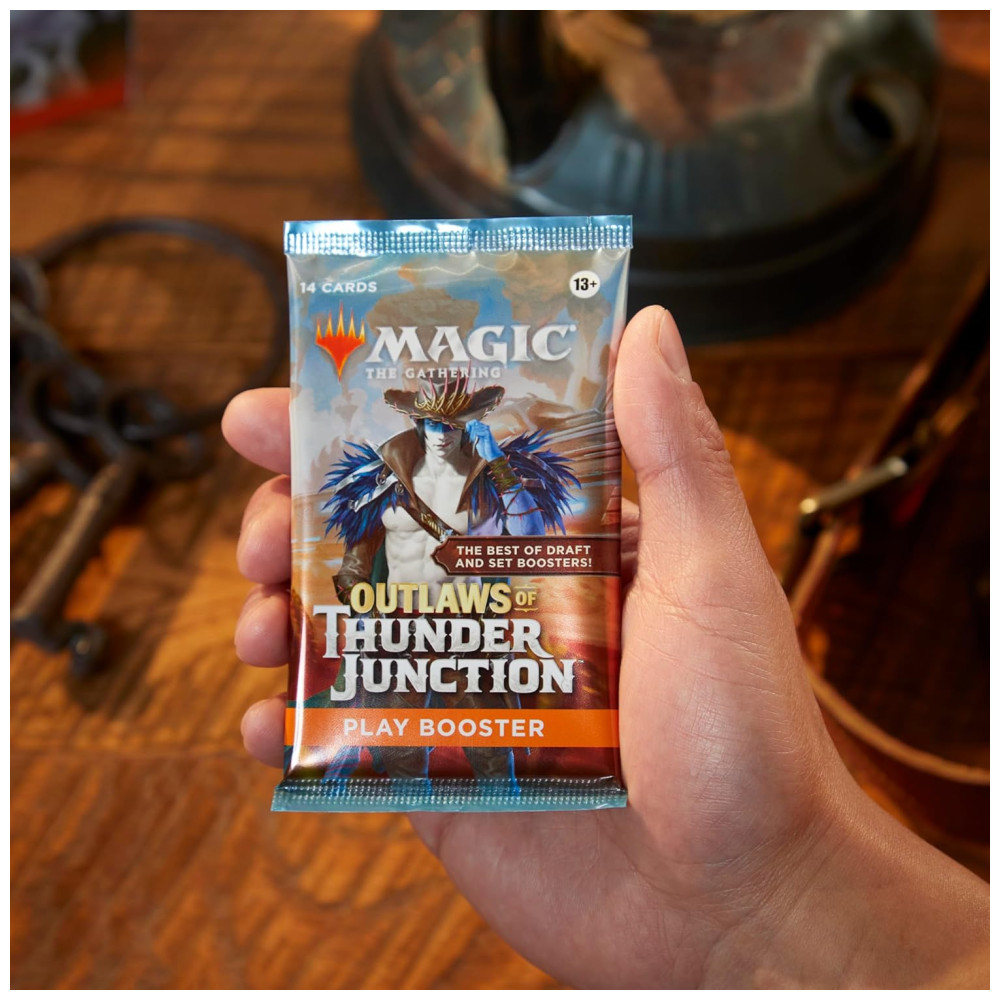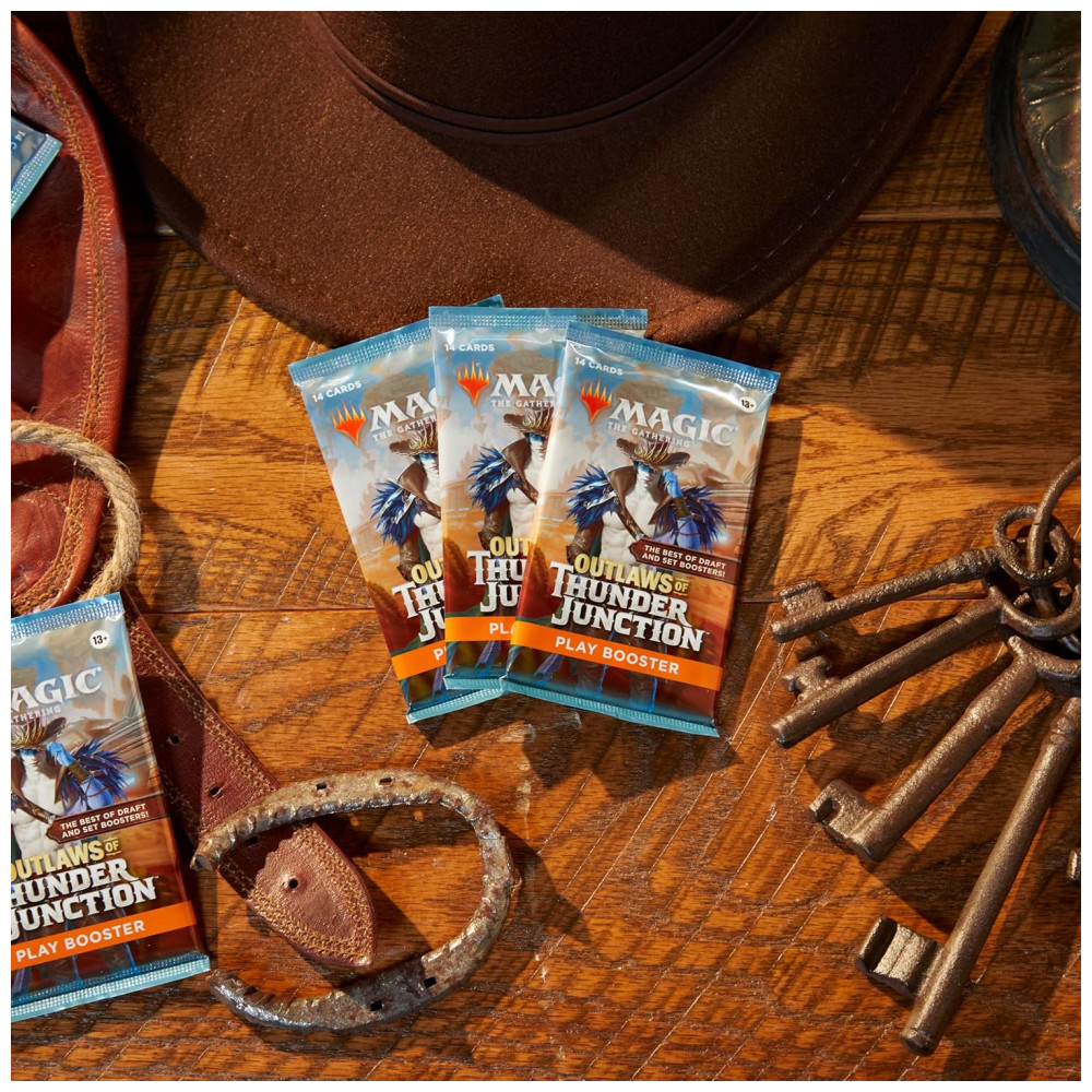 PODE CONTER CARTÕES DE ARTE, EXCLUSIVOS DO PLAY BOOSTER- Agora encontrados apenas nos Play Boosters, alguns pacotes também contêm um cartão de Arte que apresenta uma obra de arte do conjunto Outlaws of Thunder Junction, às vezes com uma assinatura do artista em folha.