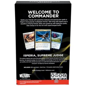 Com este deck você pode voar com Isperia e um esquadrão de amigos voadores, manter a guarda alta com feitiços defensivos e avançar para a vitória com buffs superalimentados. O conjunto inclui 1 baralho WhiteBlue de 100 cartas de Magic com 1 carta de comandante lendário de arte alternativa e 99 cartas não foil, incluindo fichas de dois lados Lands10, uma caixa de baralho e contadores perfurados.