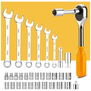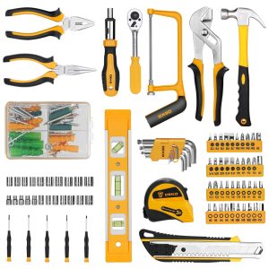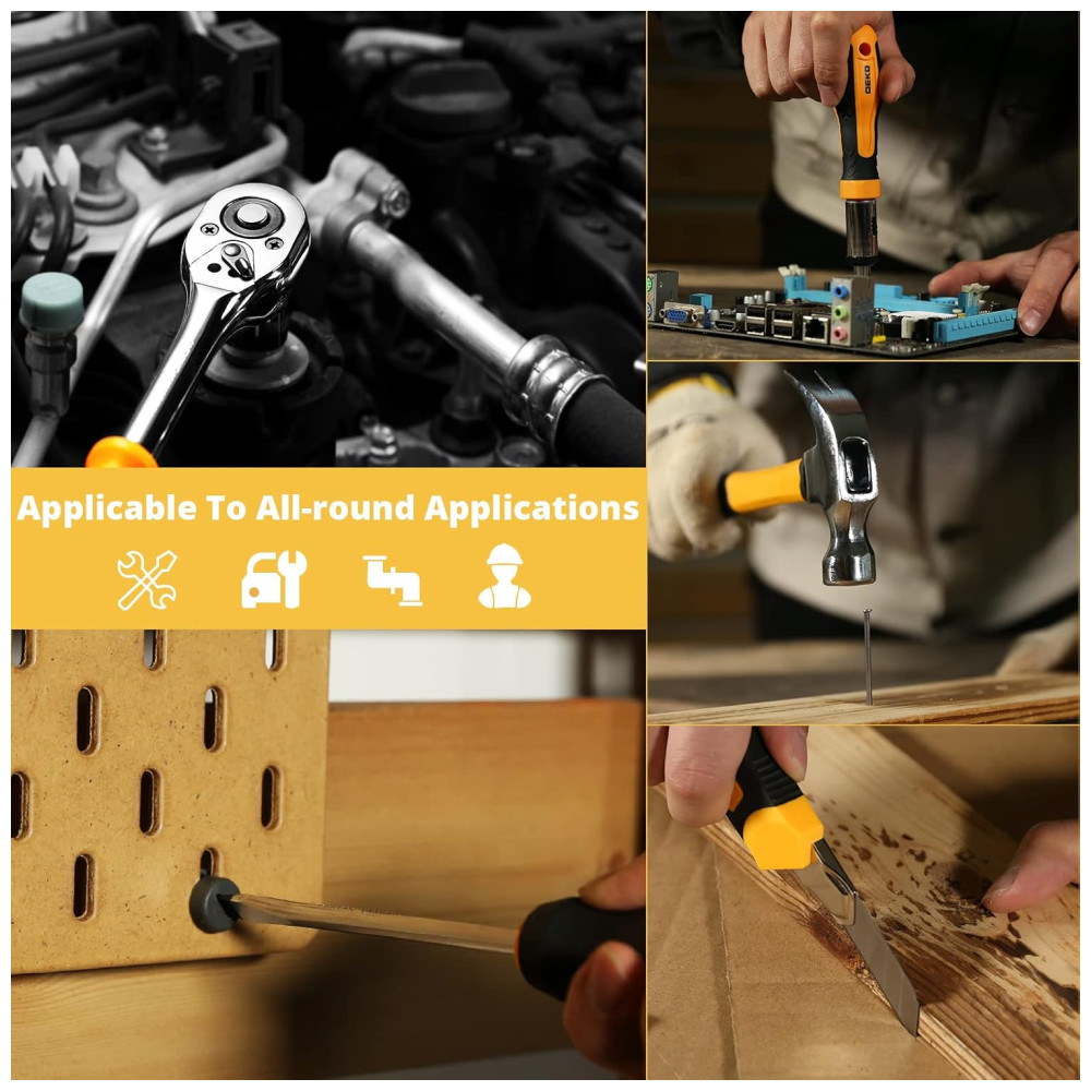 ALTA QUALIDADE E PADRÕES Forjados a partir de aço de alta qualidade e acabados em cromo de alto polimento, resistência, durabilidade, proteção anticorrosiva.Todas as ferramentas atendem ou excedem os padrões críticos ANSI COMPLETAS VARIEDADES Contém ferramentas necessárias para a maioria dos pequenos reparos e projetos DIY básicos em torno da casa.Perfeito para Handyman, reparadores, trabalhadores da construção civil, mecânica, lojas de corpo, etc também uma grande ferramenta para ter em casa, garagem e oficina INCLUI Variedade abrangente de chaves de grau profissional, catracas, uma gama completa de Soquetes do tamanho métrico de 1, 4 de polegada e 3, 8 de polegada e chave de fenda de precisão, martelo, fita métrica, alicate, chave inglesa, etc. A catraca de 72 dentes desloca facilmente para mudar de direção com um movimento de 5 graus.Variedade de 1 , Bits de chave de fenda de 4 polegadas Phillips, fenda, quadrado, estrela e pozi.Também inclui alça de aperto suave na chave de fenda, alicate, srtipper e martelo fornece excelente conforto e controle FÁCIL DE CARREGAR E ARRUMAÇÃO Alojado em uma caixa moldada por sopro acessível para fácilzenamento e portabilidade de ferramentas. Seu interior resistente e organizador mantém ferramentas no lugar PROJETO DE GRANDE ORGINALIDADE caixa preta torna resistente à sujeira. Design de forma de diamante torna único e moda. Tamanho do caso 17,5 13,5 3,94 . Peso líquido 12,78 lb