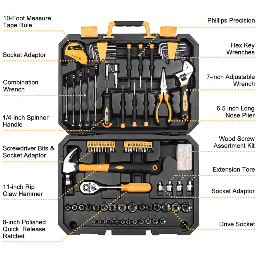 Conjunto inclui 12 soquetes de acionamento de 6 pontos de 1, 4 de polegada MM 4, 4,5, 5, 5,5, 6, 7, 8, 9,10, 11, 12, 13 9 3, 8 inch 6 Soquetes de driver de ponto SAE 5, 16, 11, 32, 3, 8, 7, 16, 1, 2, 9, 16, 5, 8, 11, 16, 3, 4 6 3, 8 inch 6 point Sockets Driver MM 10,12,14,17,19,21 3 Extensão Tore Socket E8, E10, E12 1 Unidade de 3, 8 polegadas por catraca de liberação rápida polido de 8 polegadas, 72 Tooth Cabeça oval 1 Martelo de garra de ripa de 11 polegadas 5 Chave de fenda de 1, 4 de polegada Bit com fenda MM 3, 4, 5, 6, 7 4 Chave de fenda de 1, 4 pol. Bit Phillips 0, 1 2, 3 5 Chave de fenda Star de 1, 4 polegada T10, T15, T20, T25, 0 2 Bit Pozz Bit 1, 4 inch PZ1, PZ2 3 1 , 4 Chave de fenda de polegada Brocas quadradas S1, S2, S3 1 1, 4 inch hex por adaptador de soquete de acionamento de 1, 4 pol. 1 Hex Magnetic Holder de 1, 4 de polegada 60mm L 1 1 , Alavanca giratória de 4 polegadas 1 Kit de Varetas de Parafuso de Madeira 5 Chave combinada MM 10,12,13,14,15 1 Regra de fita de 10 pés Medida 8 Chaves sextavadas MM 1,5, 2, 2,5 3, 4, 5,5,5, 6 8 chaves sextavadas SAE 1, 4, 7, 32, 3, 16, 5, 32, 1, 8, 3, 32, 5, 64, Chave de fenda com precisão de 1, 16 3 com fenda MM 1.0, 2.0, 3.0 3 Chave de fenda de precisão Phillips 0, 1, 2 1 Alicate para nariz comprido de 6,5 polegadas 1 Chave ajustável de 7 polegadas 1 Adaptador de soquete 1 Estojo de zenamento ATENÇÃO Ao abrir a caixa de ferramentas, coloque o logotipo DEKO sobre ele