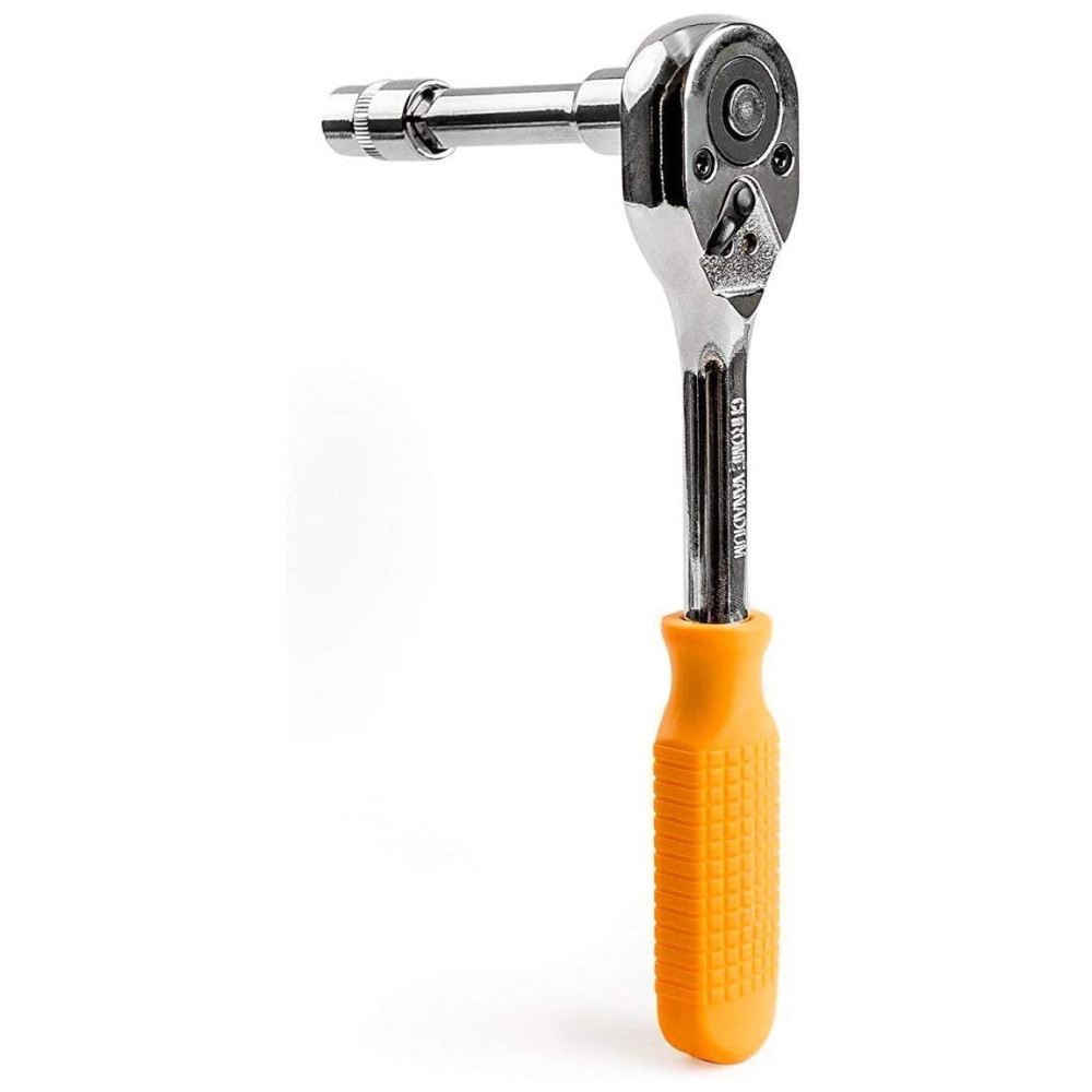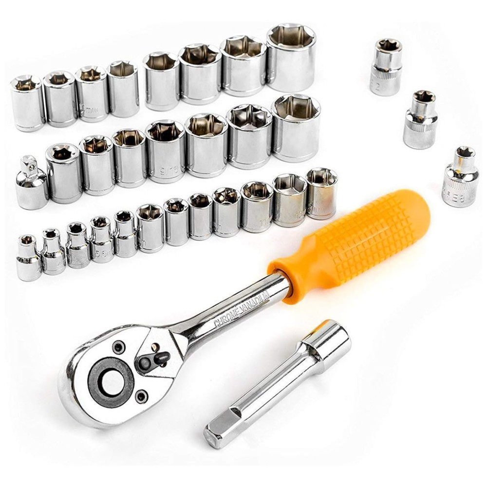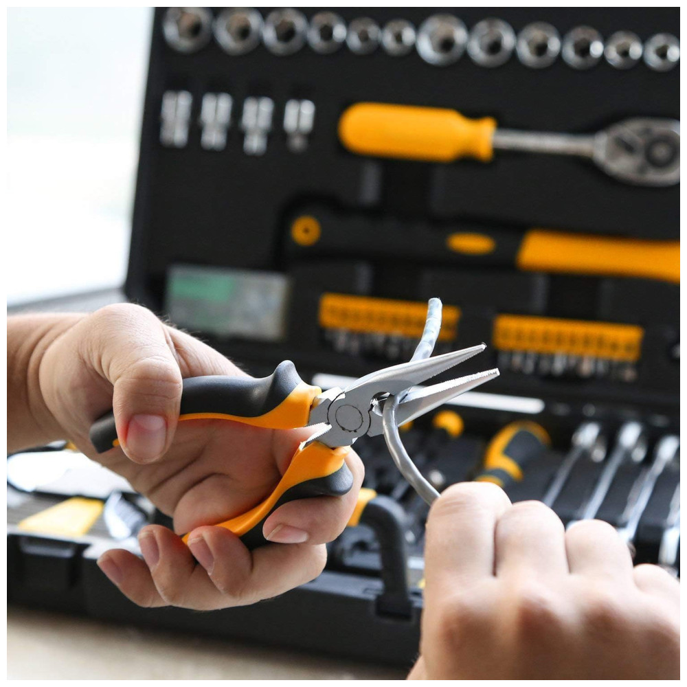 ALTA QUALIDADE E PADRÕES Forjados a partir de aço de alta qualidade e acabados em cromo de alto polimento, resistência, durabilidade, proteção anticorrosiva.Todas as ferramentas atendem ou excedem os padrões críticos ANSI COMPLETAS VARIEDADES Contém ferramentas necessárias para a maioria dos pequenos reparos e projetos DIY básicos em torno da casa.Perfeito para Handyman, reparadores, trabalhadores da construção civil, mecânica, lojas de corpo, etc também uma grande ferramenta para ter em casa, garagem e oficina INCLUI Variedade abrangente de chaves de grau profissional, catracas, uma gama completa de SAE e soquetes de tamanho métrico e bits de chave de fenda, martelo, fita métrica, alicates, também inclui 1, 4 de polegada e 3 , 8inch conjunto de soquete, garantir o tamanho exato. E a catraca de 72 dentes desloca se facilmente para mudar de direcção com um movimento de 5 graus. Variedade de pontas de aparafusar de 1, 4 polegadas Phillips, ranhurada, quadrada, estrela e pozi FÁCIL DE CARREGAR E ARRUMAR Instalada à mão case para fácil zenamento e portabilidade de ferramentas. Seu interior resistente e organizador mantém ferramentas no lugar PROJETO DE GRANDE ORGINALIDADE caixa preta torna resistente à sujeira.Diamond design de forma torna o único e moda .Case tamanho 15,35 11,02 3,54 . Peso líquido 7,60 kg
