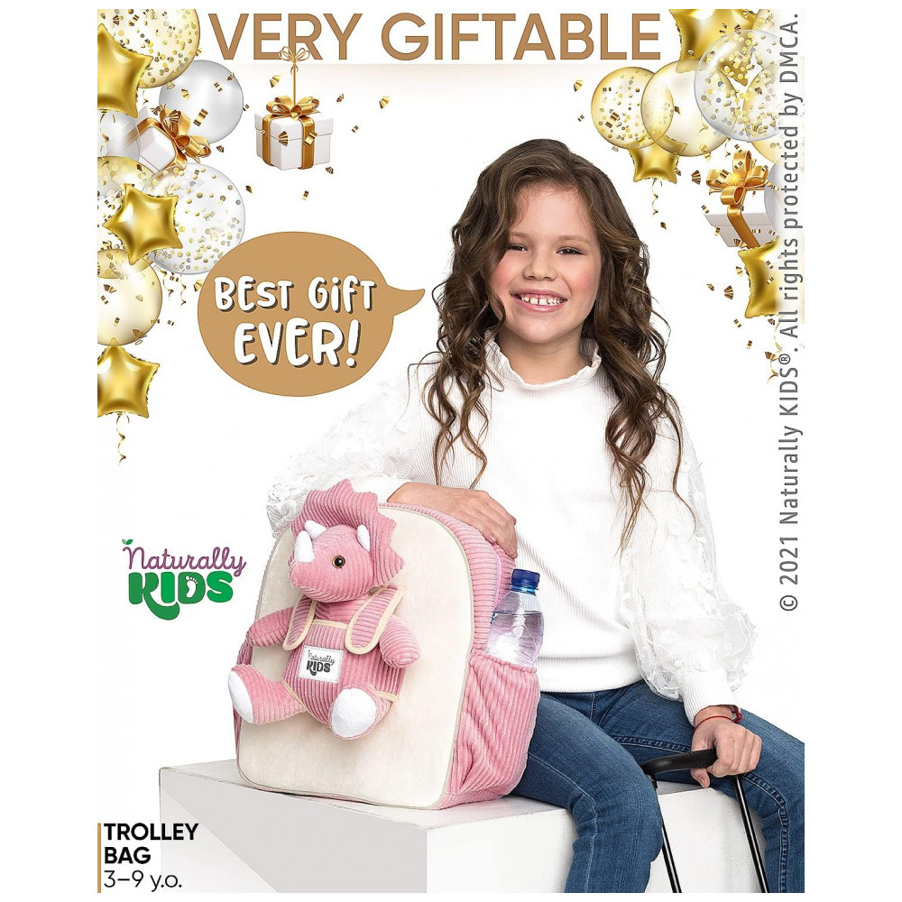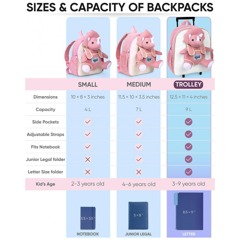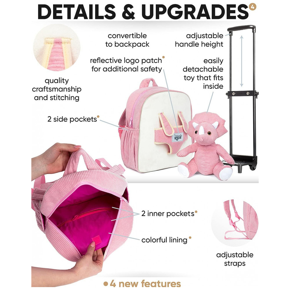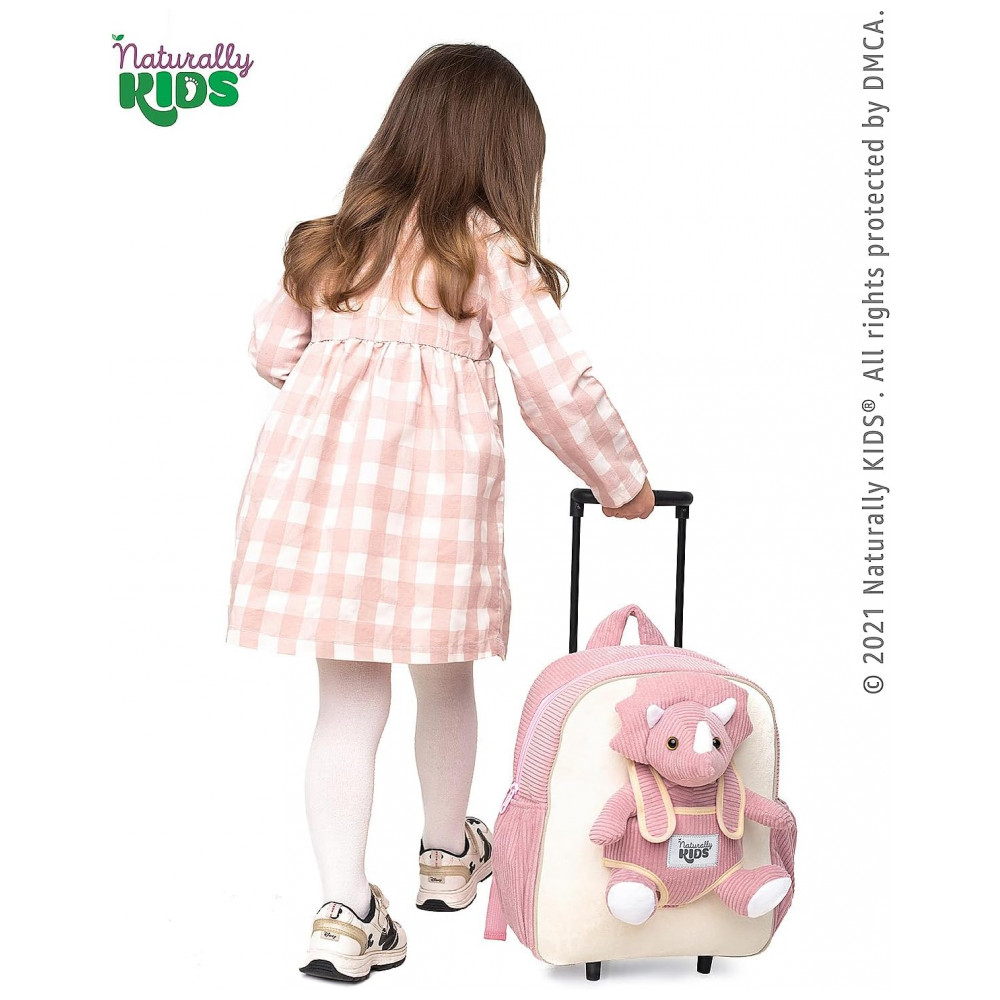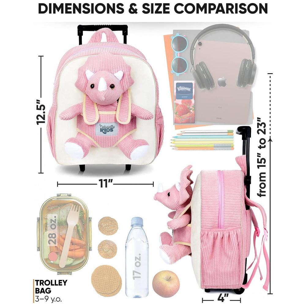As alças acolchoadas são ajustáveis para uso nas costas, e o sistema de rodinhas com alça retrátil permite que a criança puxe a bagagem em viagens, passeios e deslocamentos. O dinossauro de pelúcia pode ser removido da parte frontal para brincar, dormir abraçado ou acompanhar a criança em diferentes ambientes, tornando o conjunto funcional tanto para transporte quanto para momentos de lazer.