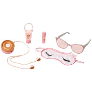 Inclui: 1 mala, 1 etiqueta de mala, 1 par de óculos de sol, 1 passaporte, 1 fólio de passaporte, 2 bilhetes de avião, 1 folha de autocolante, 1 máscara para os olhos, 1 par de fones de ouvido de jogo, etc, 1 suporte de orelha, 1 bálsamo labial e tampa, 1 desinfetante para as mãos e tampa, 1 mapa de viagem com estojo.