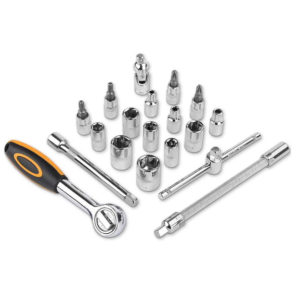 ACESSÓRIOS COMPLETOS Acessórios ricos de ferramentas atualizadas colocadas neste conjunto de ferramentas. Inclui martelo de fenda, alicate de linha, alicate de ponta longa, chave catraca, fita métrica, alicate macho e fêmea, soquetes de unidade, brocas de chave de fenda, junta universal, barra de extensão e mais