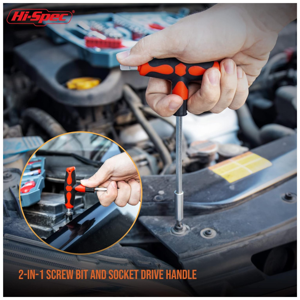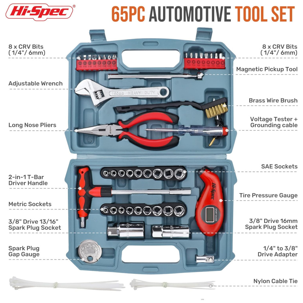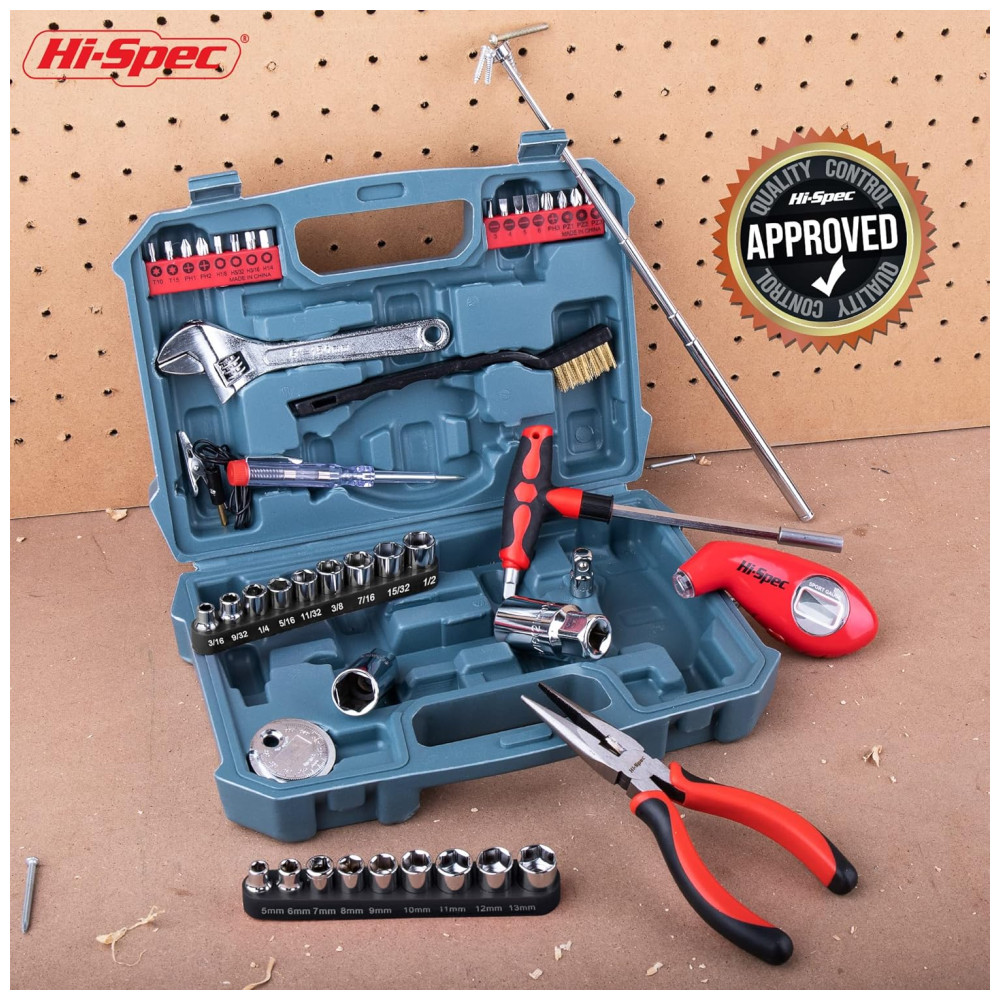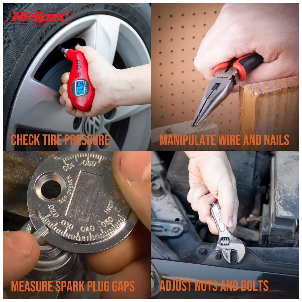 DE VOLTA À STRADA Para reparos e manutenção de carros, motos, o conjunto de ferramentas Hi Spec Autochanics com soquetes e motores e conjuntos Autochanics uma variedade de acessórios dos motores e manutenção e acessórios de ferramentas e acessórios de manutenção. Completo em uma caixa de ferramentas para zenamento no porta malas, porta malas ou um assento SOQUETES RIC SAE COM PUNHO T BAR Gire porcas e sextavada com conjunto de 20 peças de soquetes de 6 pontos de cabeça METRIC SAE tamanhos comumente s de 5mm a 16mm e 3,16in a 13,16in. com uma alça T Bar, uma alavanca de giro extra com uma alça da mão coberta por uma alça moldada em TPR antiderrapante MEDIDOR DE PNEUS E ACESSÓRIO Facilite o trabalho na manutenção do veículo. Use o medidor de pressão de ar digital para obter resultados. Meça e ajuste como velas de folga com uma ferramenta de folga. Teste como baterias e os componentes de conexão com a prática de cabos de sondas de 24V ALICATES, CHAVE E PICKUP Use o alicate de ponta longa, agulha para comparar e cabos, pequenos e cabos, e também aparar com seus mini cortadores . Puxe a ferramenta magnética telescópica extensível para facilmente pegar peças de metal caídas em posições profundas e rebaixadas. Aperte ou solte como maior com a chave segura. PARAFUSO ESCOVA Desa uma variedade de tipos de fenda, com o cabo da chave de fenda T Bar e seus bits de chave intercambiáveis, incluindo Slot, Flat, Pozidriv, Torx e Hex, Allen. E chega o adaptador de soquete para os soquetes de unidade maiores de 3, 4 pol. Inclui uma mangueira de arame rígido de cabo também para remoção de escova, por e arame, acessórios e rodas incluídos